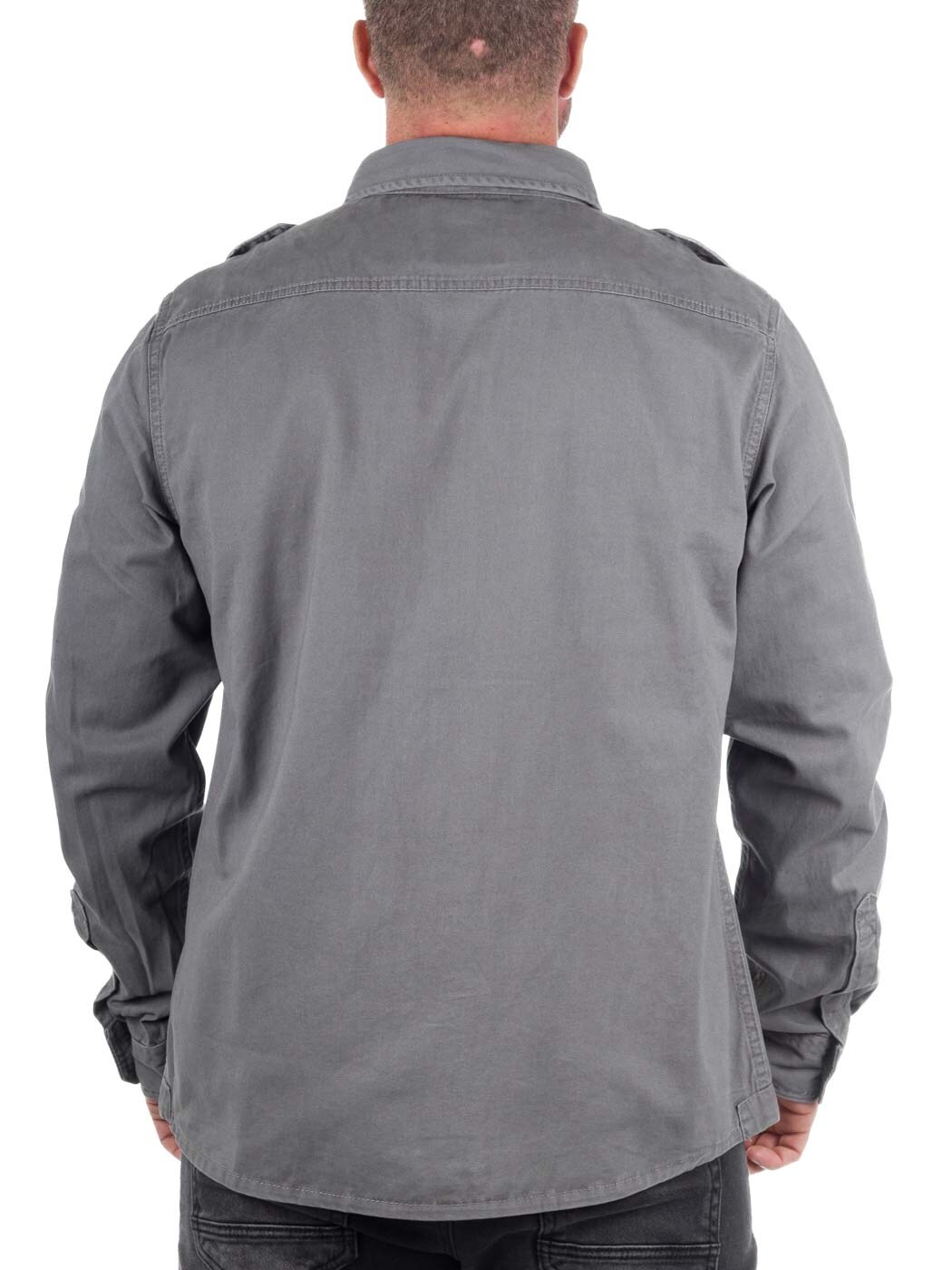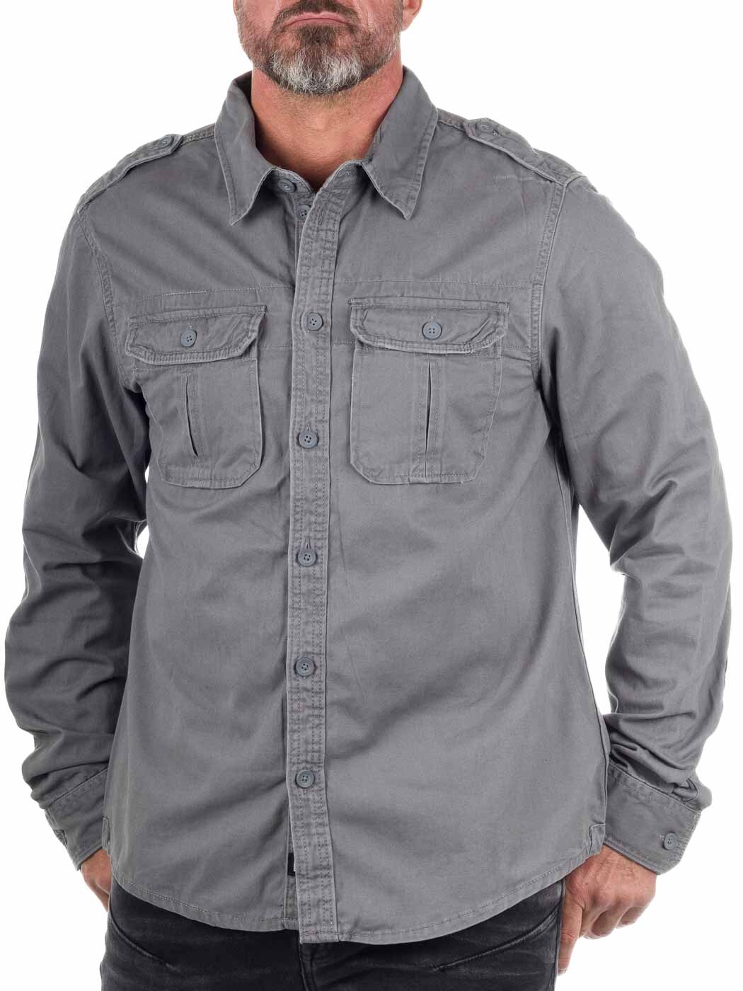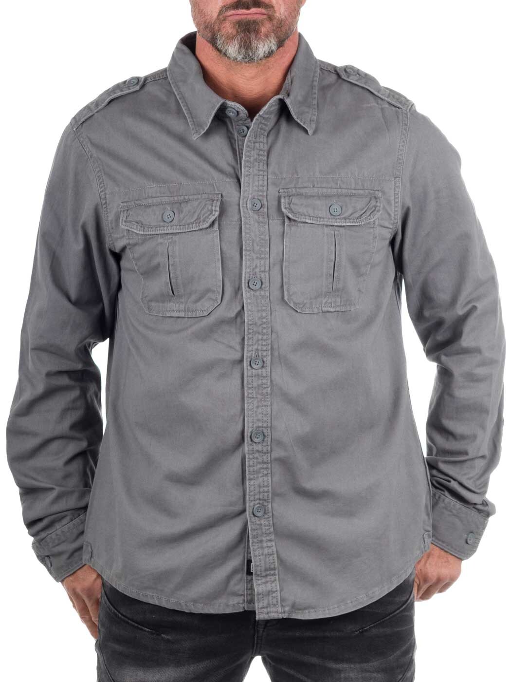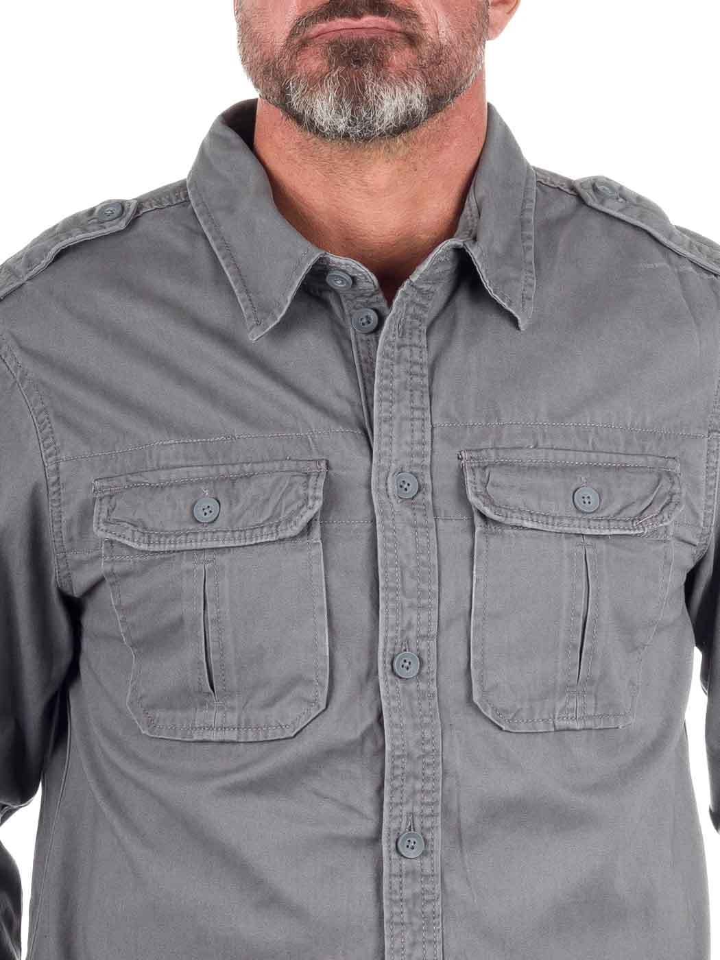 Tuff skjorta i kraftigt bomullsmaterial med hällar på axlarna, krage och bröstfickor som stängs med knappar. Detaljerad med grova sömmar och en svart tygpatch med logga i linningen.
