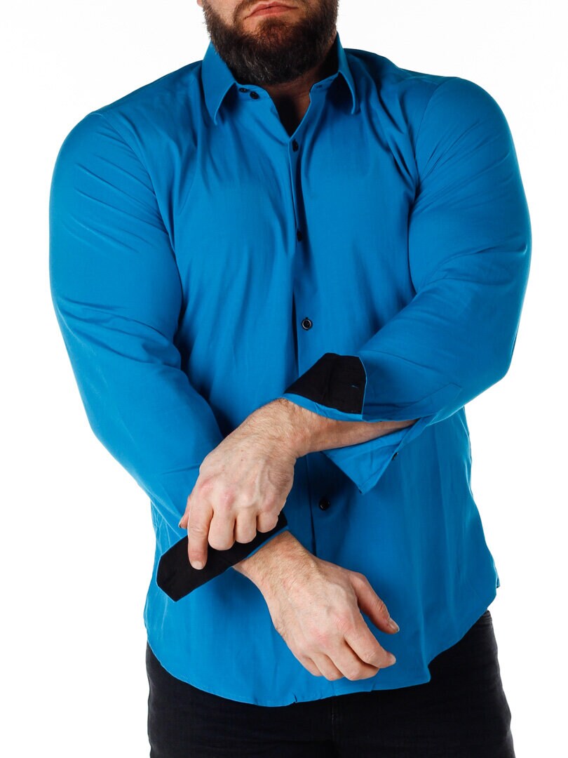 Bomullskjorta i bekväm modell som är något stretchig. Blå bas med knappar, insida krage och ärmslut i kontrastfärg. Smalare modell med rundad linning nertill och förstärkt krage som håller formen. Finns i fler färger!