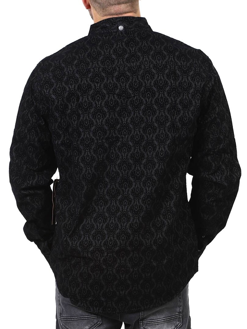 Denna premiumskjorta från Rocknrolla Collection kombinerar mörk elegans med ren attityd. Den är tillverkad av 100% mjuk, förtvättad bomull och utmärker sig med ett svart-på-svart brokadmönster i flockad sammet som ger en upphöjd struktur. Skjortan är full av genomtänkta detaljer som knappar i åldrad metall med dödskallemotiv och ett kontrasterande tyg med dödskallerosor på insidan av krage och manschetter. Med sin moderna, smalare passform sitter den snyggt på kroppen.