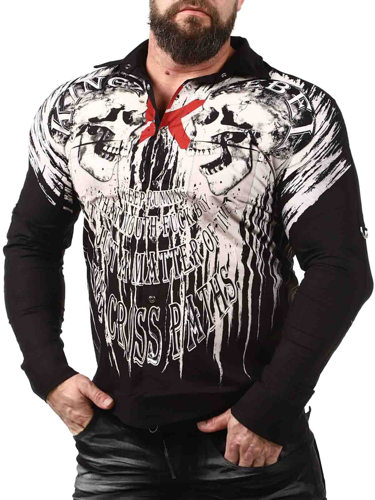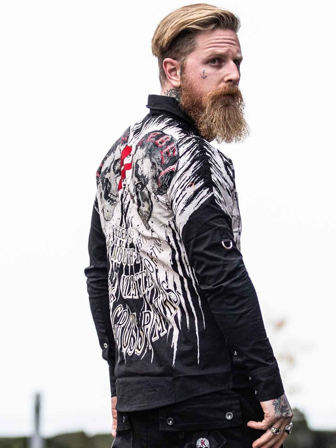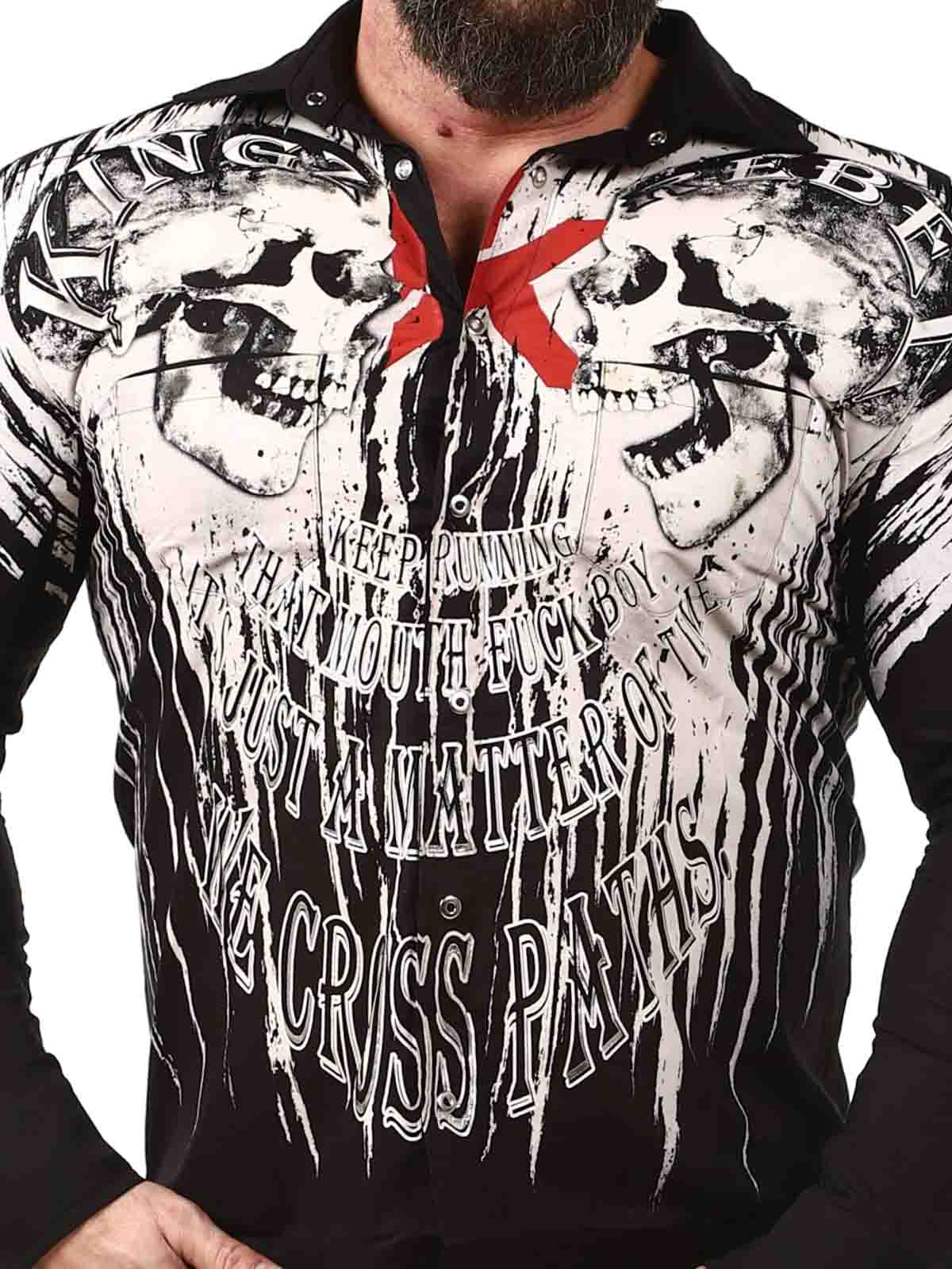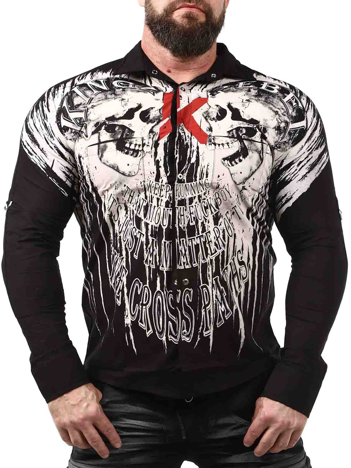 Svart skjorta med tuffa tryck i kontrastfärger. Designad med stadig krage, tyckknappar och två bröstfickor. Ärmarna kan vikas upp och fästas med slejf.