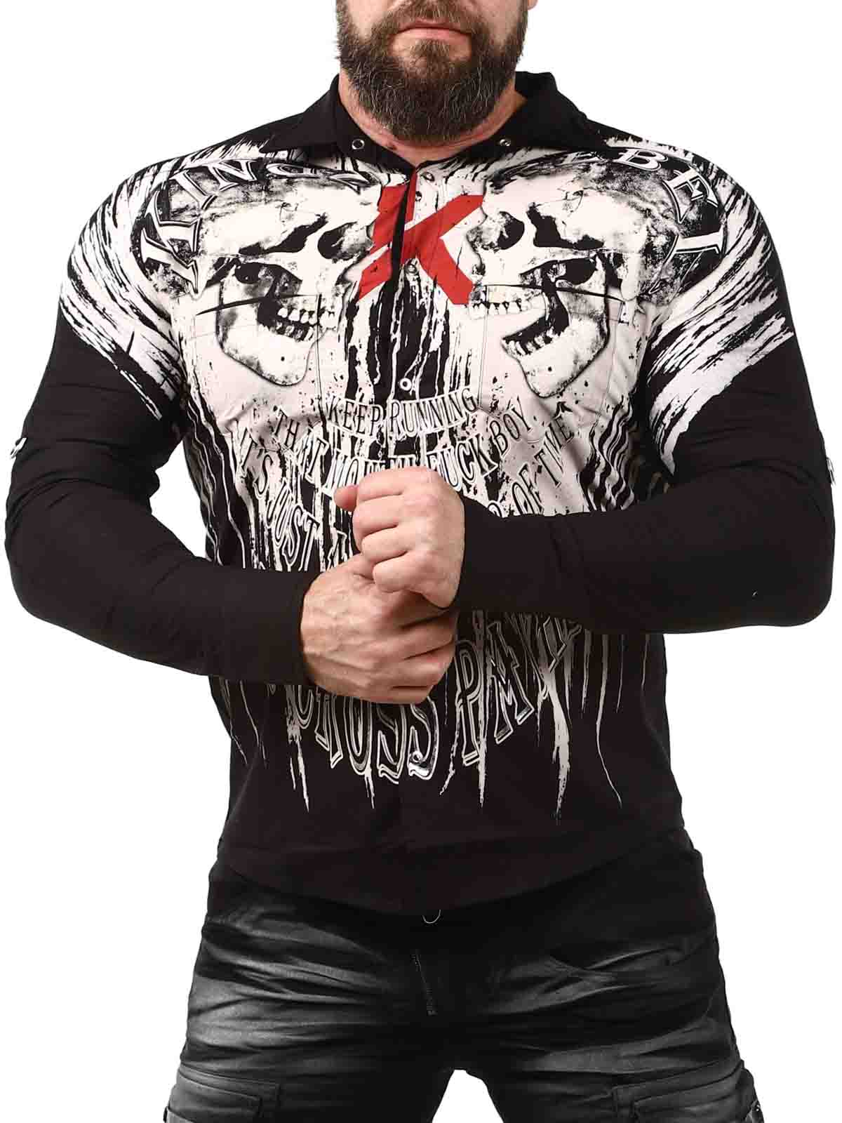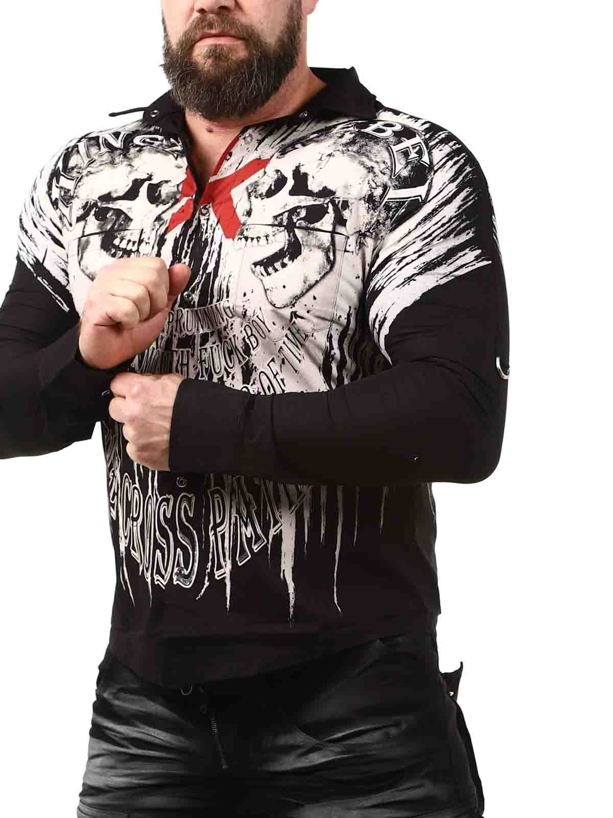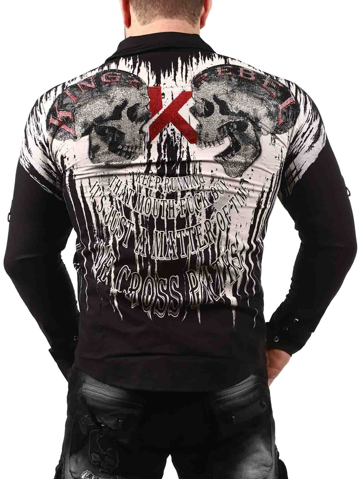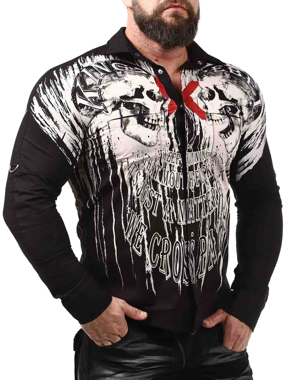Svart skjorta med tuffa tryck i kontrastfärger. Designad med stadig krage, tyckknappar och två bröstfickor. Ärmarna kan vikas upp och fästas med slejf.