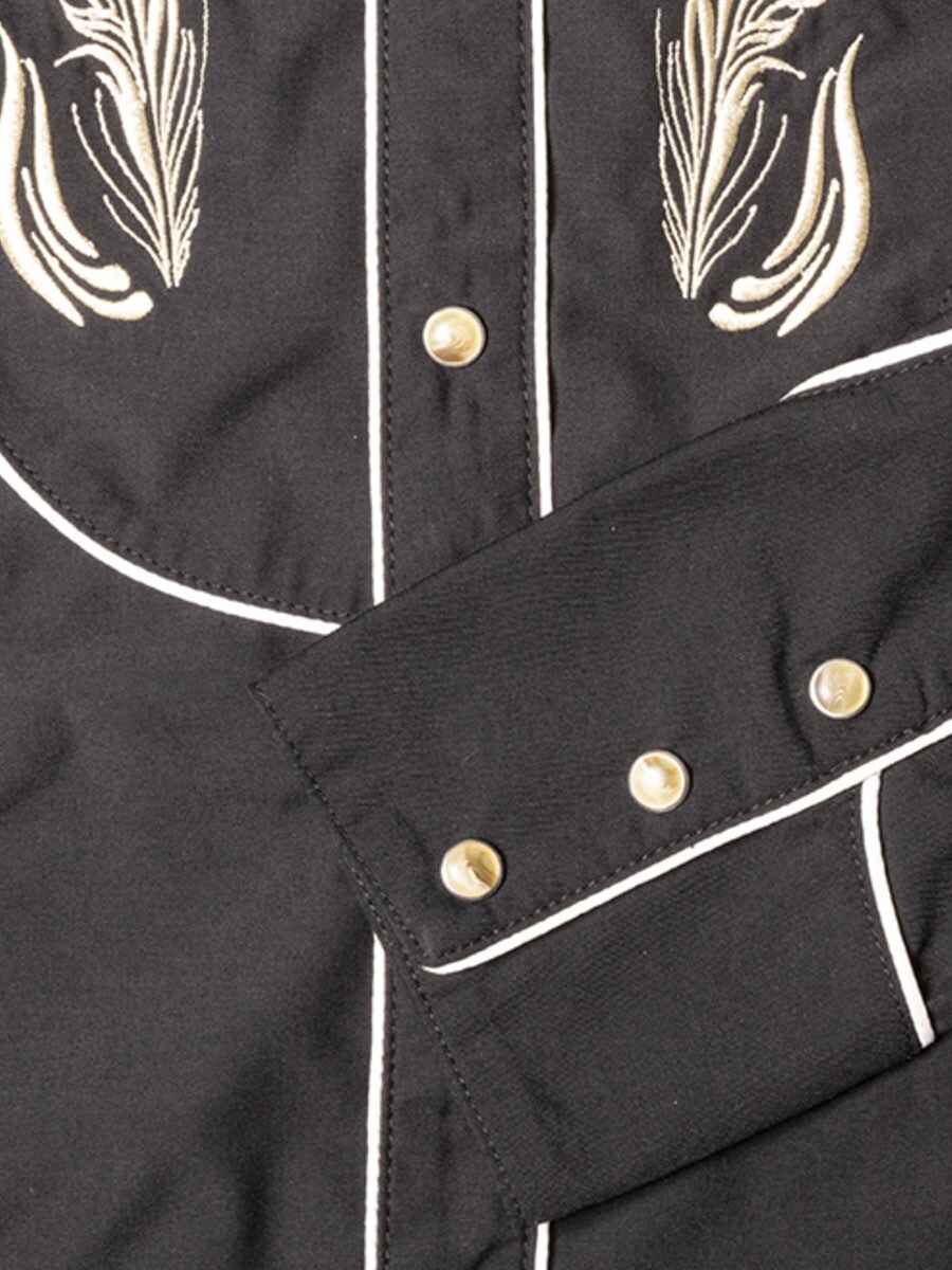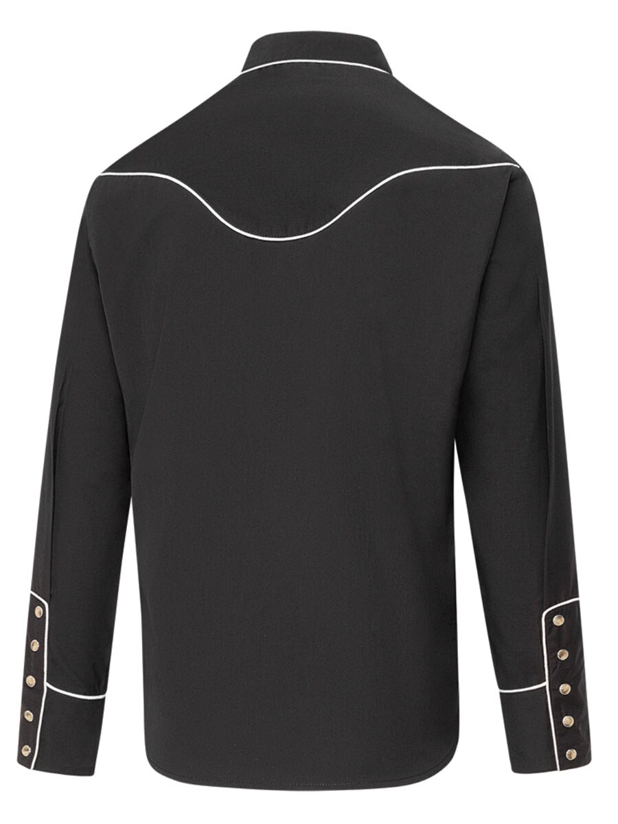 Svart westernskjorta med en stilren design och karaktäristiska detaljer. Den svarta skjortan har dekorativ brodyr på bröstet som ger ett autentiskt westernuttryck och en tydlig cowboykänsla. Kontrasterande passpoaler framhäver skjortans linjer och ger en elegant detalj som lyfter designen. Materialblandningen av polyester och viskos gör skjortan både mjuk, bekväm och slitstark