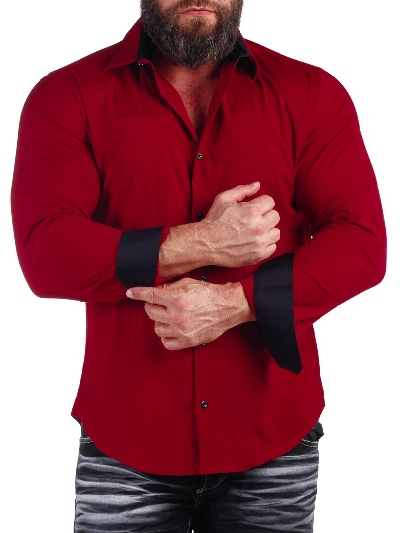 Bomullskjorta i bekväm modell som är något stretchig. Röd bas med knappar, insida krage och ärmslut i kontrastfärg. Smalare modell med rundad linning nertill och förstärkt krage som håller formen.
