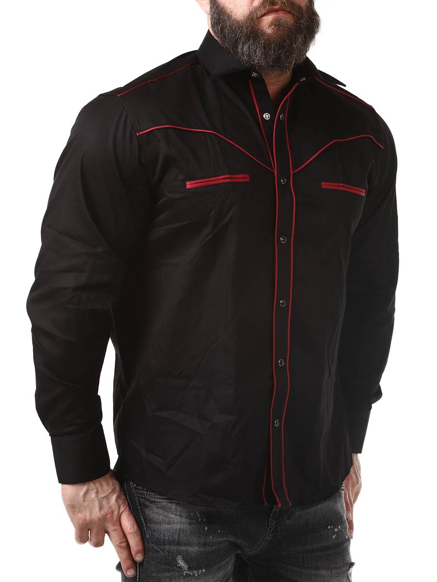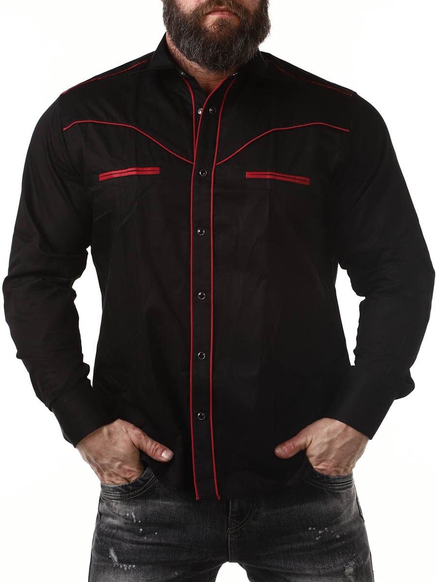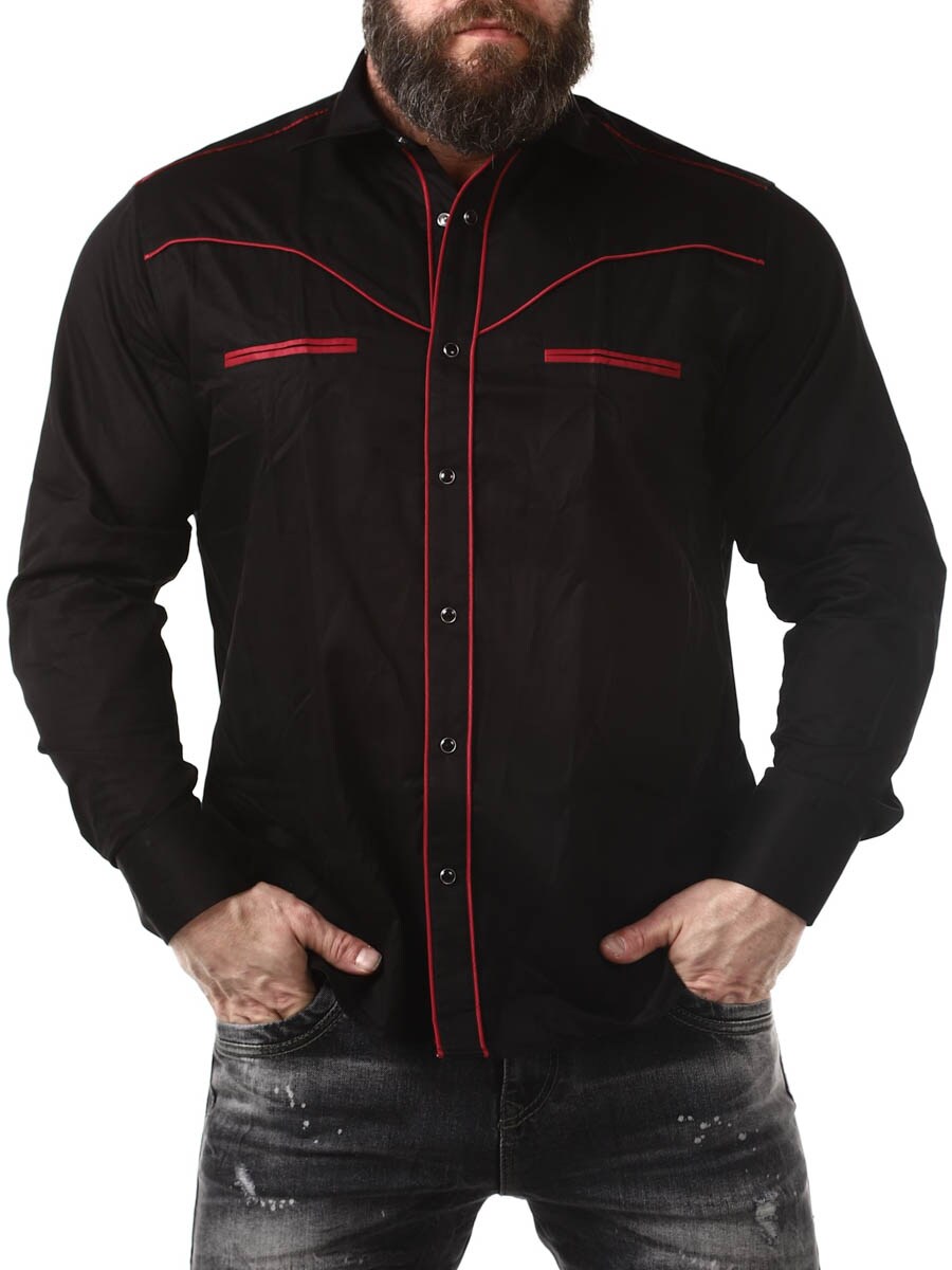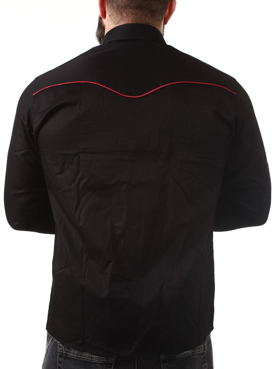 Svart skjorta med kontrastsömmar som ger en snygg western-look. Designad med tryckknappar, två fuskfickor fram och rundad linning nertill. Tillverkad i 100% bomull.