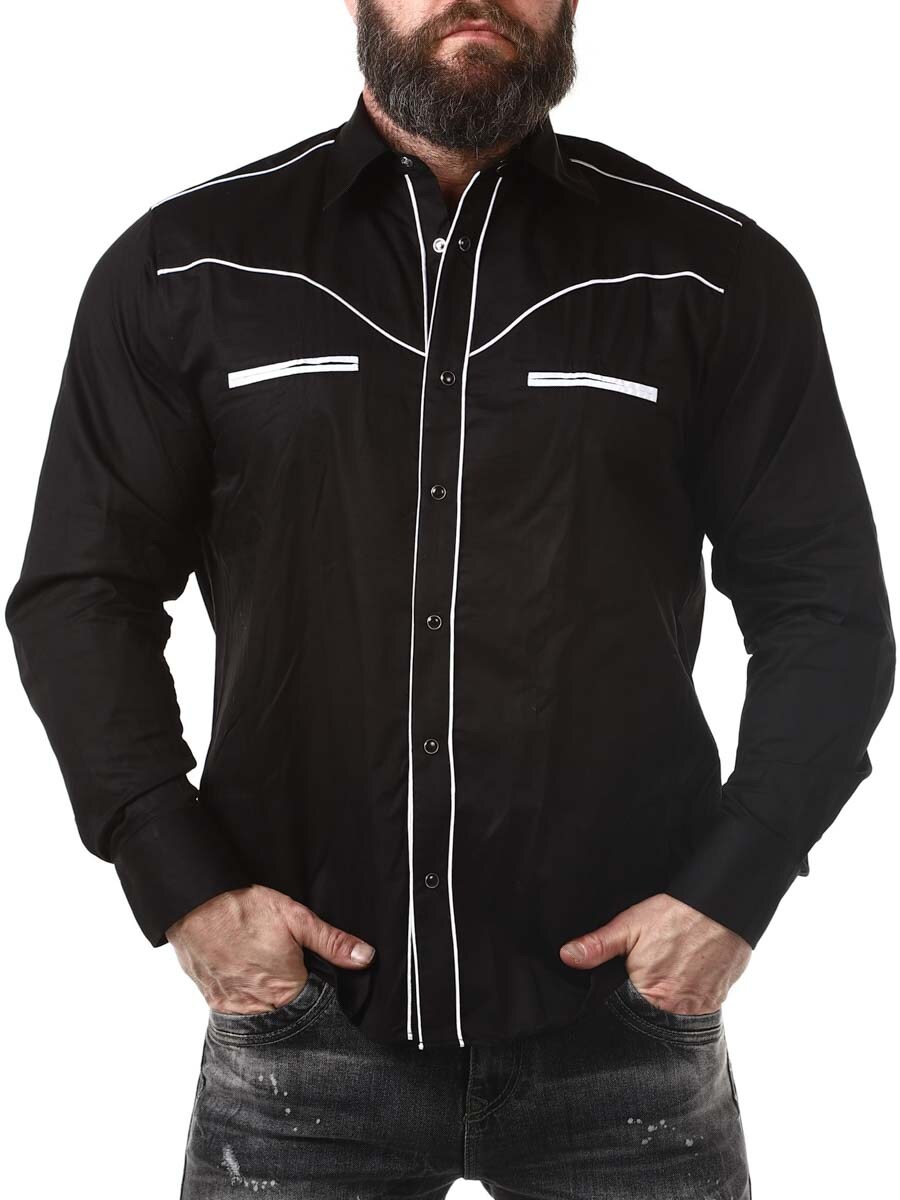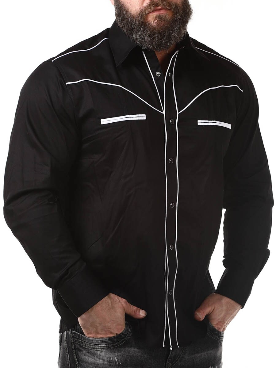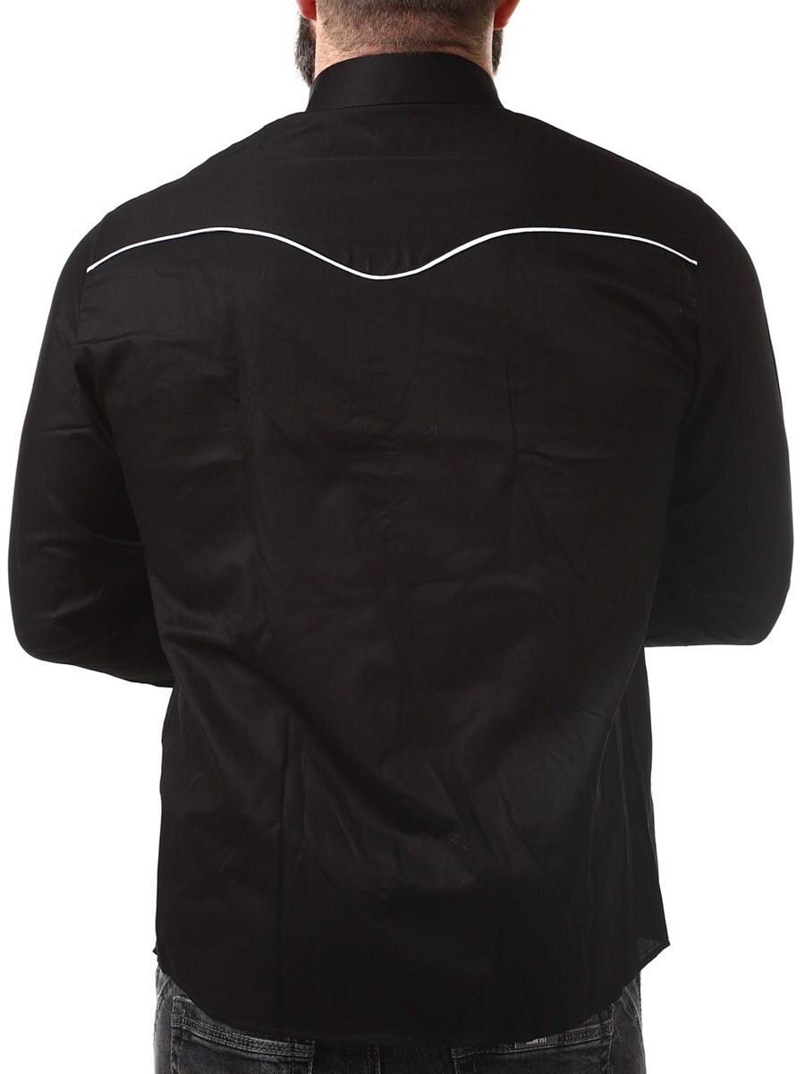 Svart skjorta med kontrastsömmar som ger en snygg western-look. Designad med tryckknappar, två fuskfickor fram och rundad linning nertill. Tillverkad i 100% bomull.