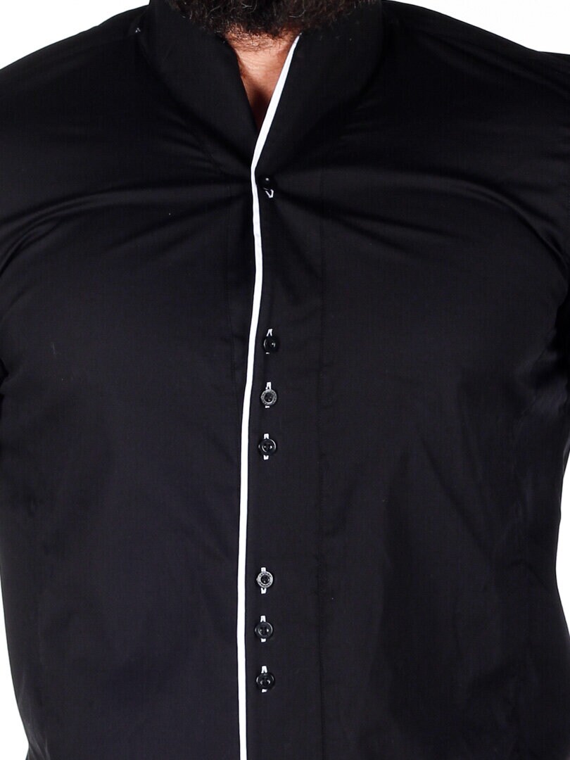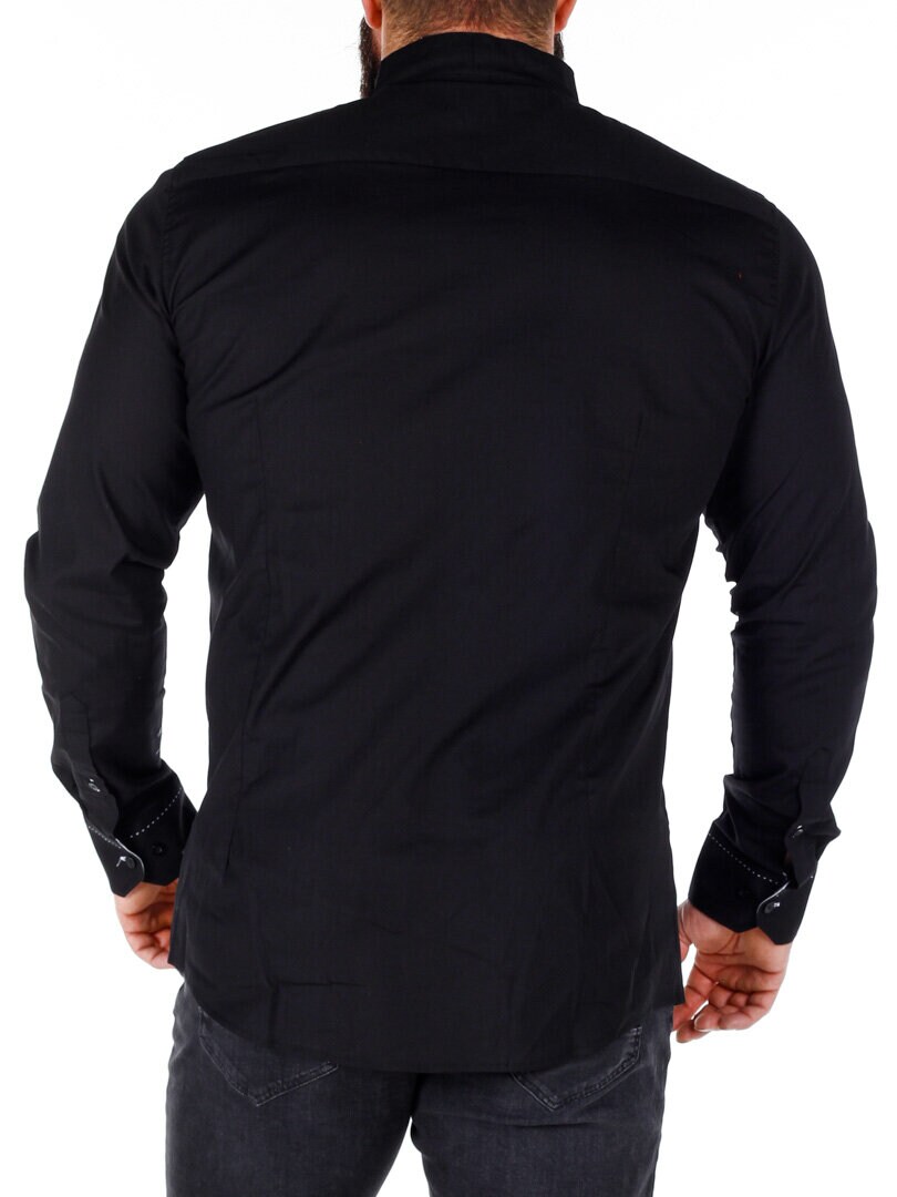Elegant skjorta i svart design som utmanar den klassiska stilen. Producerad i mjukt bomullsmaterial som är något stretchigt med svarta knappar och kroppsnära passform. Den har vita kontrastdetaljer som ger en snygg effekt till den svarta basen.