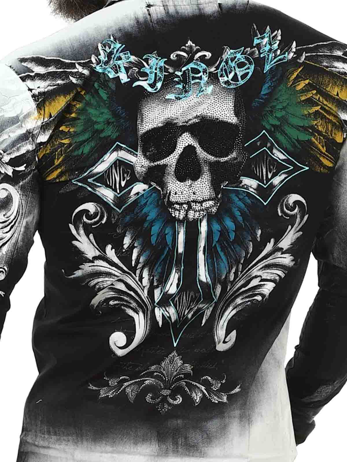 Svart skjorta med tuffa tryck i kontrastfärger och strasstenar. Designad med stadig krage, tyckknappar och två bröstfickor. Ärmarna kan vikas upp och fästas med slejf.