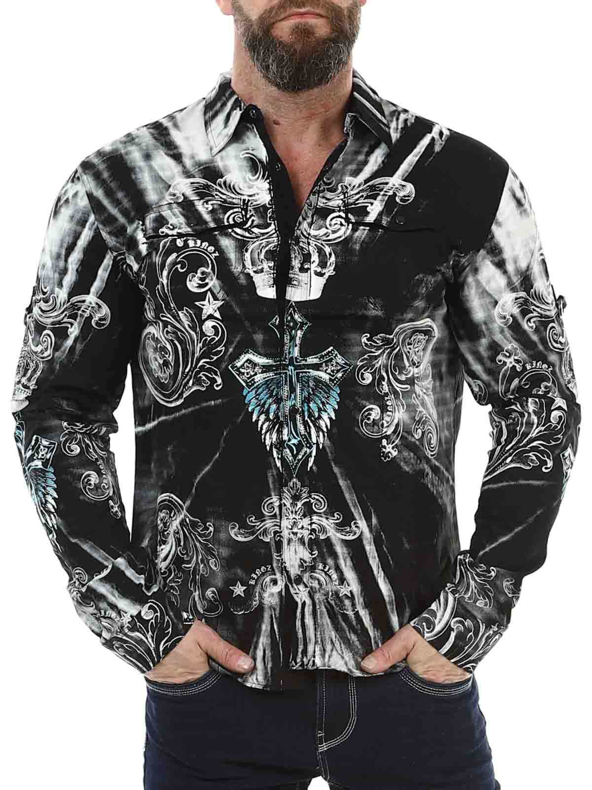 Svart skjorta med tuffa tryck i kontrastfärger och strasstenar. Designad med stadig krage, tyckknappar och två bröstfickor. Ärmarna kan vikas upp och fästas med slejf.