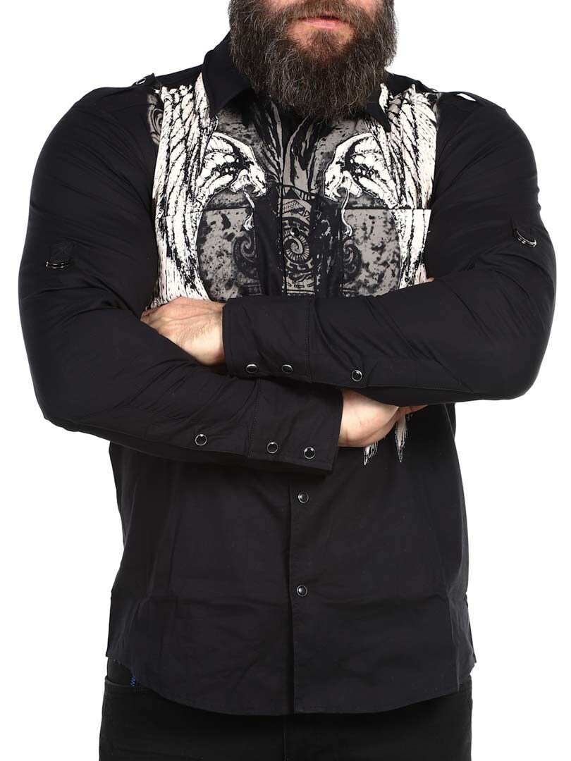 Svart skjorta med tuffa tryck i kontrastfärger. Designad med stadig krage, tyckknappar och två bröstfickor. Ärmarna kan vikas upp och fästas med slejf.
