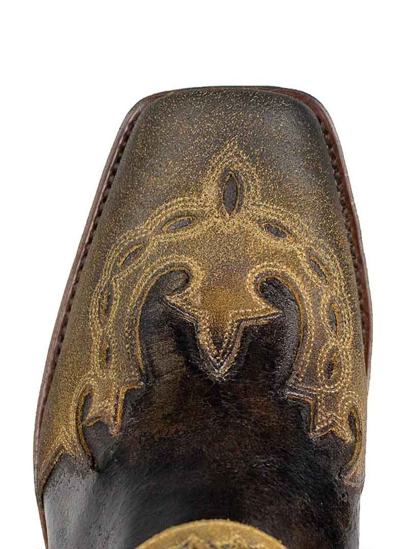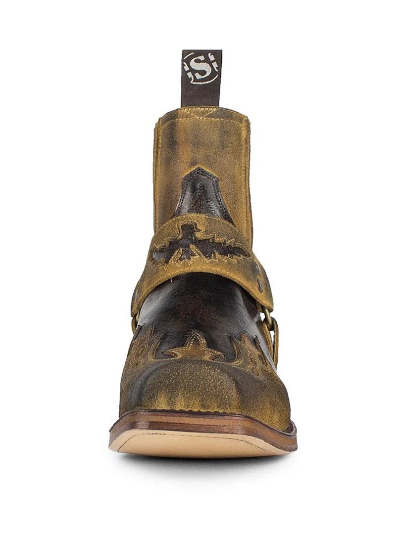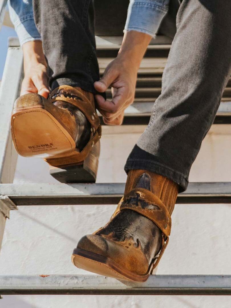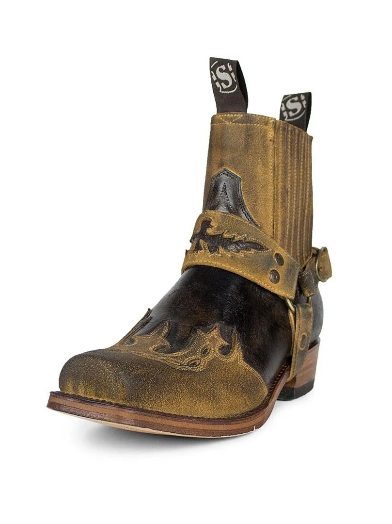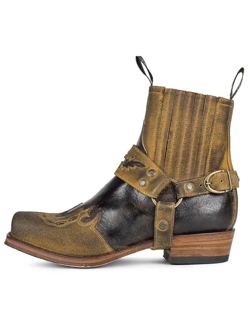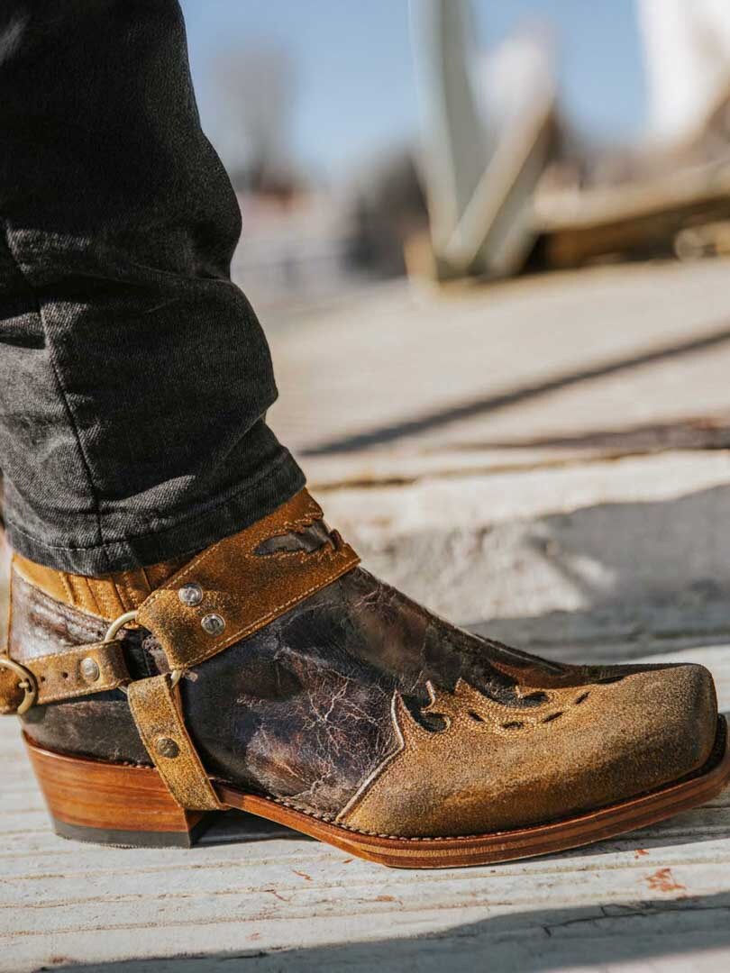 Korta westernboots som kombinerar klassisk cowboyestetik med en rockig twist. Tillverkade i äkta läder med broderier, dekorativa harness-remmar och elastiska sidopaneler för enkel på- och avtagning. Dessa handgjorda skor erbjuder både hållbarhet och en rå, maskulin look.