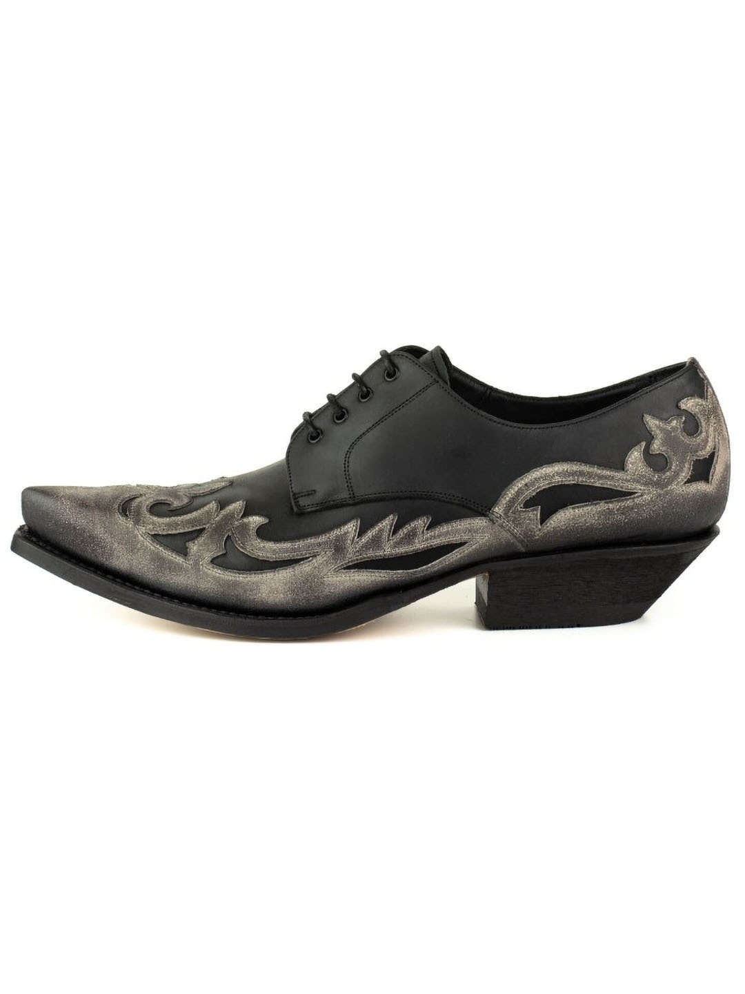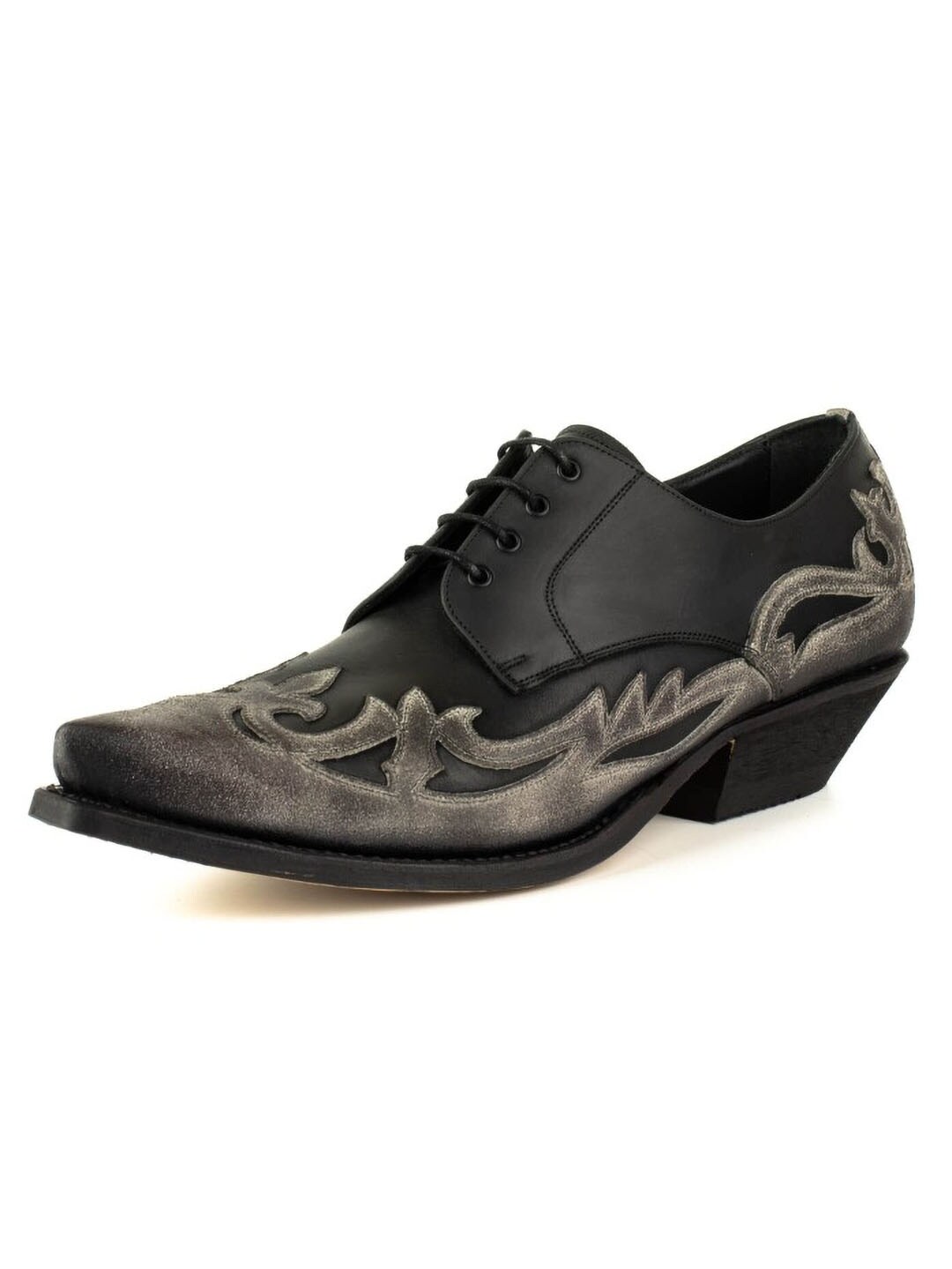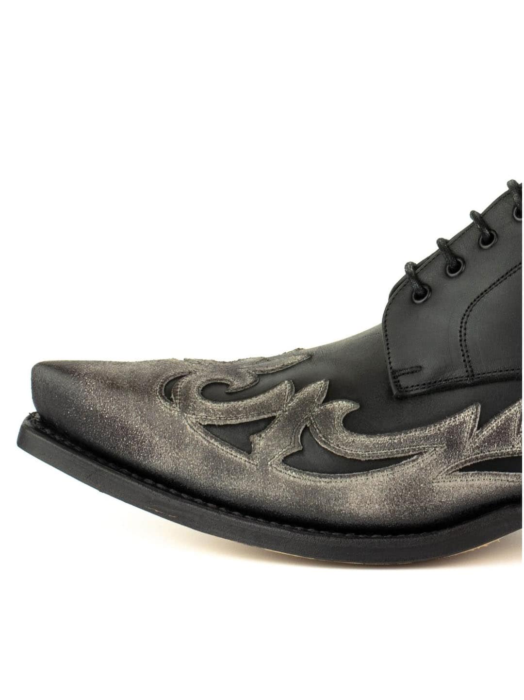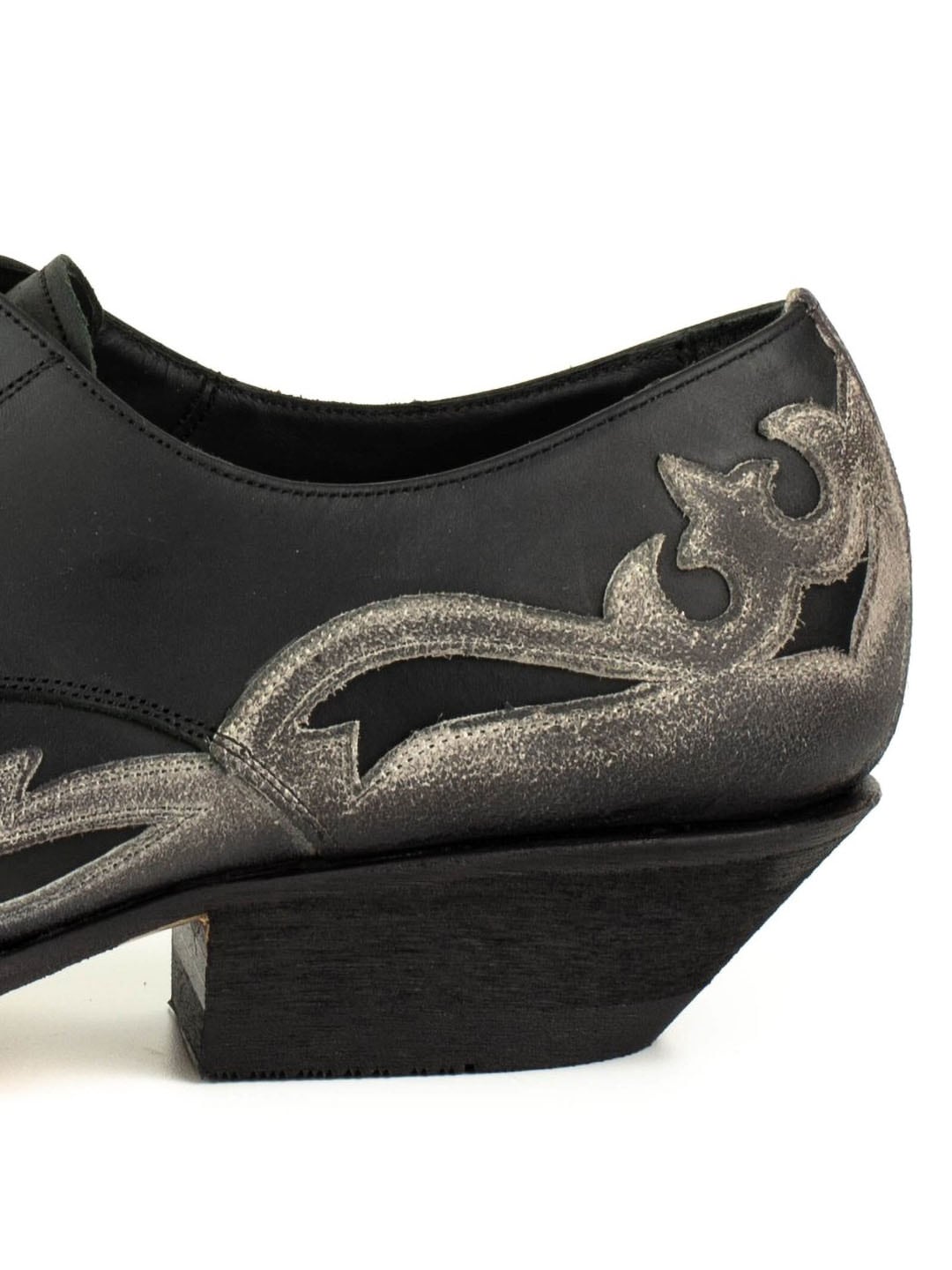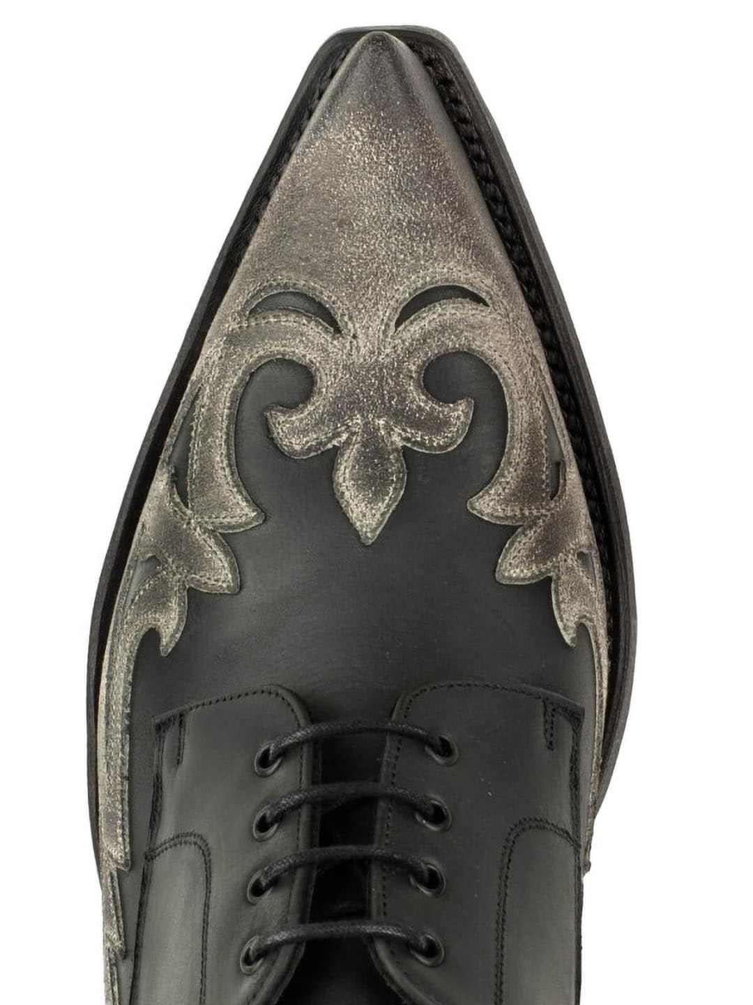 En unik sko i rustikt, åldrat läder med svart och grå nyans som skapar en naturlig vintagekänsla. Den profilerade designen och de utskurna detaljerna ger ett distinkt westernuttryck som verkligen står ut. Sulan är tillverkad i spanskt kalvskinn och skon är handgjord enligt det klassiska Goodyear Welt-systemet - en av de mest hållbara och prestigefyllda konstruktionerna inom skotillverkning. Resultatet är en sko med imponerande livslängd, stabilitet och hög komfort som formar sig efter foten över tid. Perfekt för dig som vill bära något både robust, elegant och fullt av karaktär!