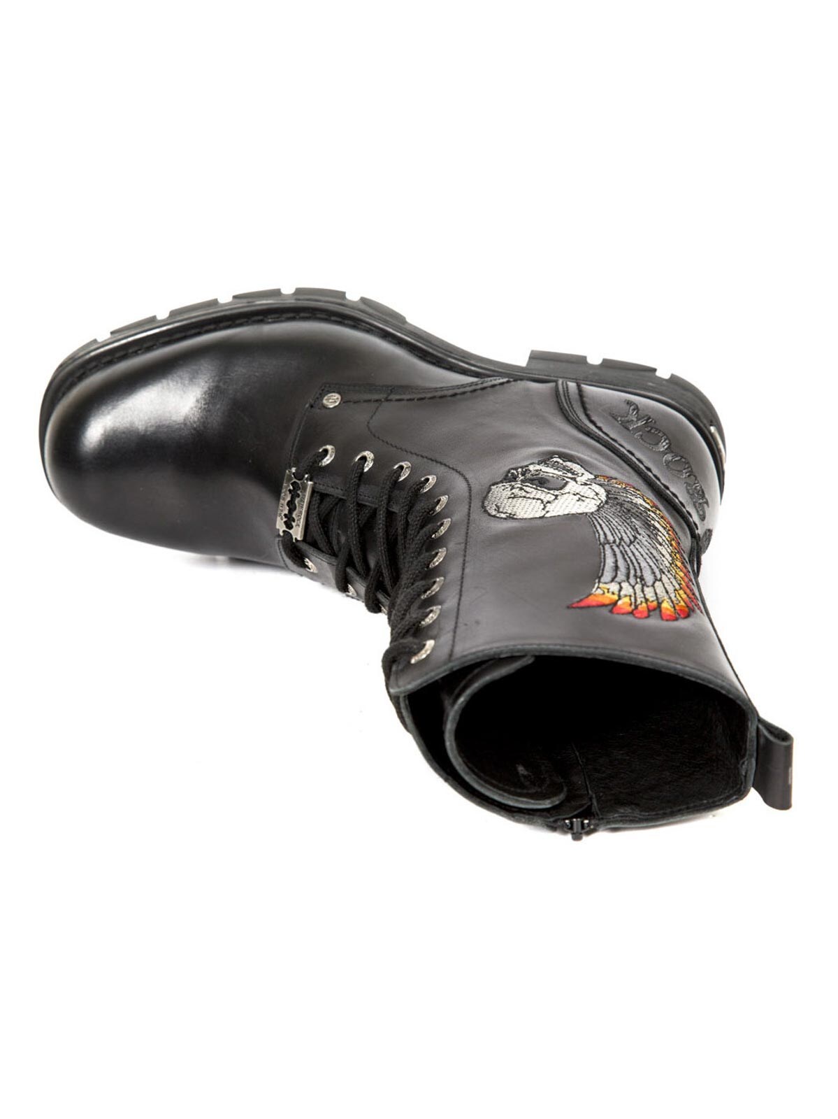 Svarta skor med mönsterbrodyr. De har högt skaft med snörning, samt dragkedja på insidan som gör dem smidiga att ta av och på. Handgjorda i äkta läder och finns i begränsad upplaga, vilket gör varje sko unik.