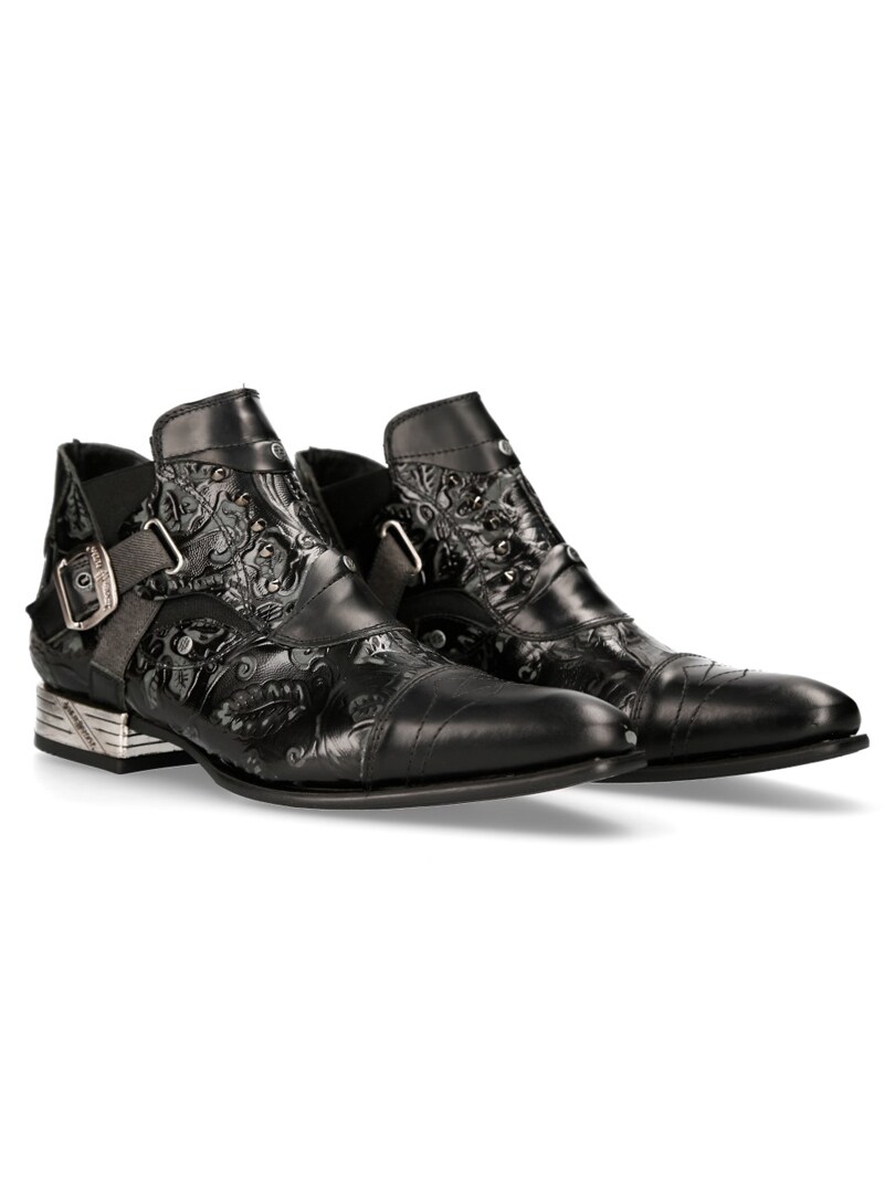 Svarta skor i äkta läder med mönster och lågt skaft. Detaljerade med nitar och remmar i resår med ett metallspänne. Resår vid skaftöppning på båda sidorna som underlättar påtagning. Denna unika sko finns i begränsad upplaga!