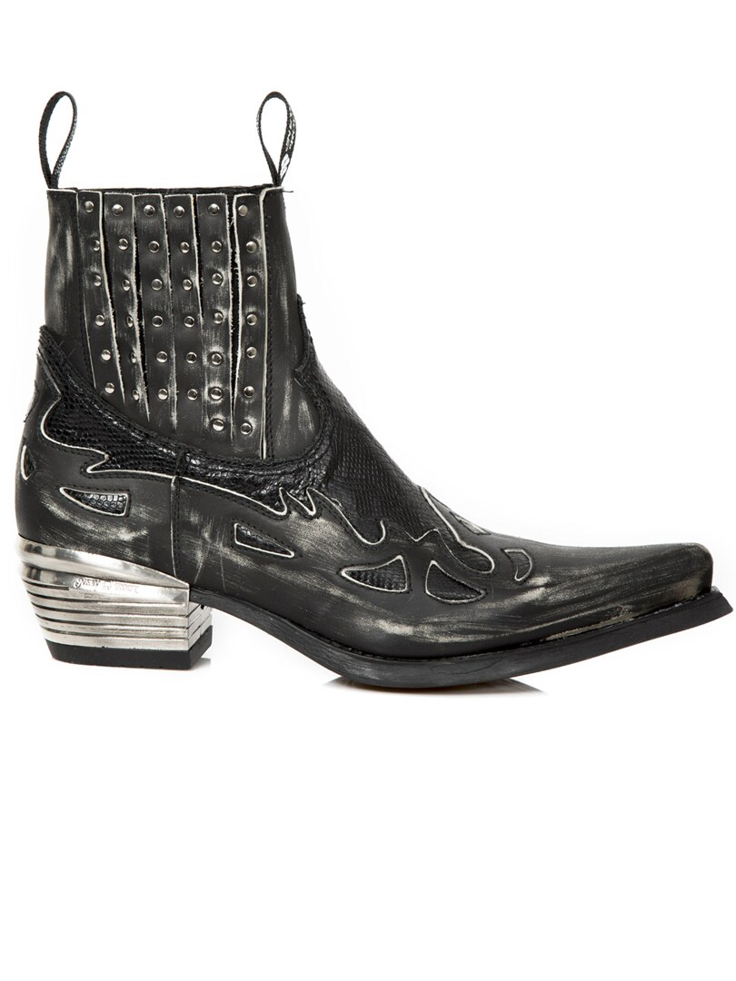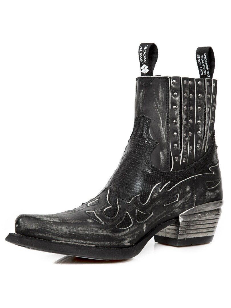 Svarta boots i en cowboy/rock. Skorna är tillverkade i Spanien av 100% äkta kvalitetsläder. Alla skor från New Rock är handgjorda i en begränsad upplaga vilket gör varje sko unik. Gummisula med ett kraftigt hälparti av metall.