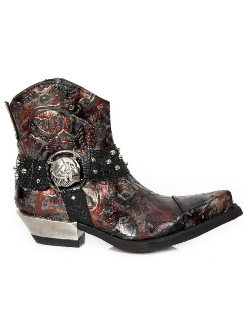 Rejäla skor i äkta läder med något högre skaft, låg klack och spetsig tå. Metallspänne med dödskalle runt ankeln och rött mönster i lädret. Klacken har ett metalliskt överdrag som förhöjer den rockiga designen.