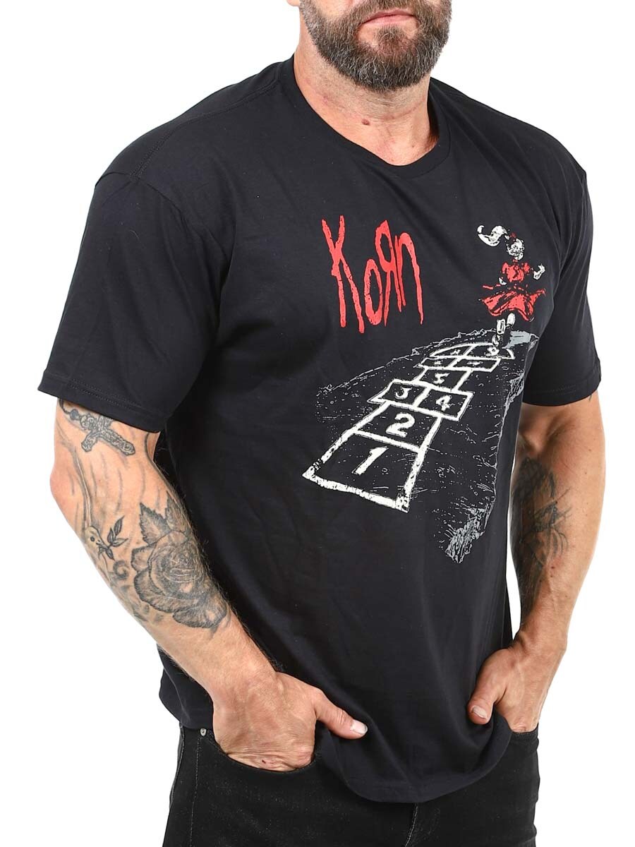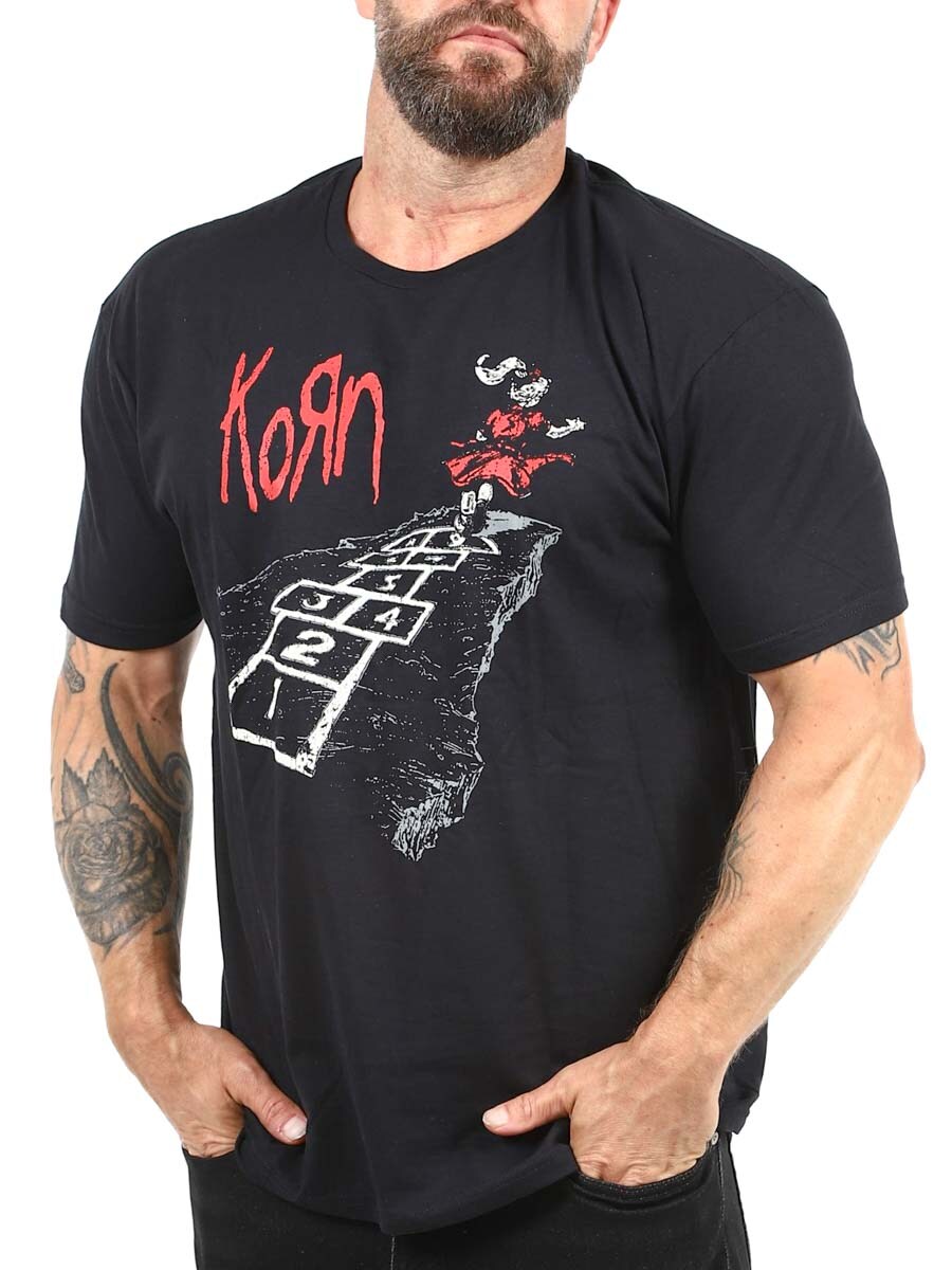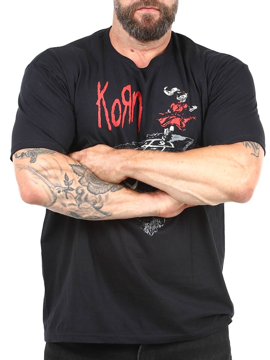 Den här svarta t-shirten med klassiskt Korn-tryck framtill är ett måste för alla som växte upp med metal och distade riff i blodet. Tillverkad i 100% bomull.