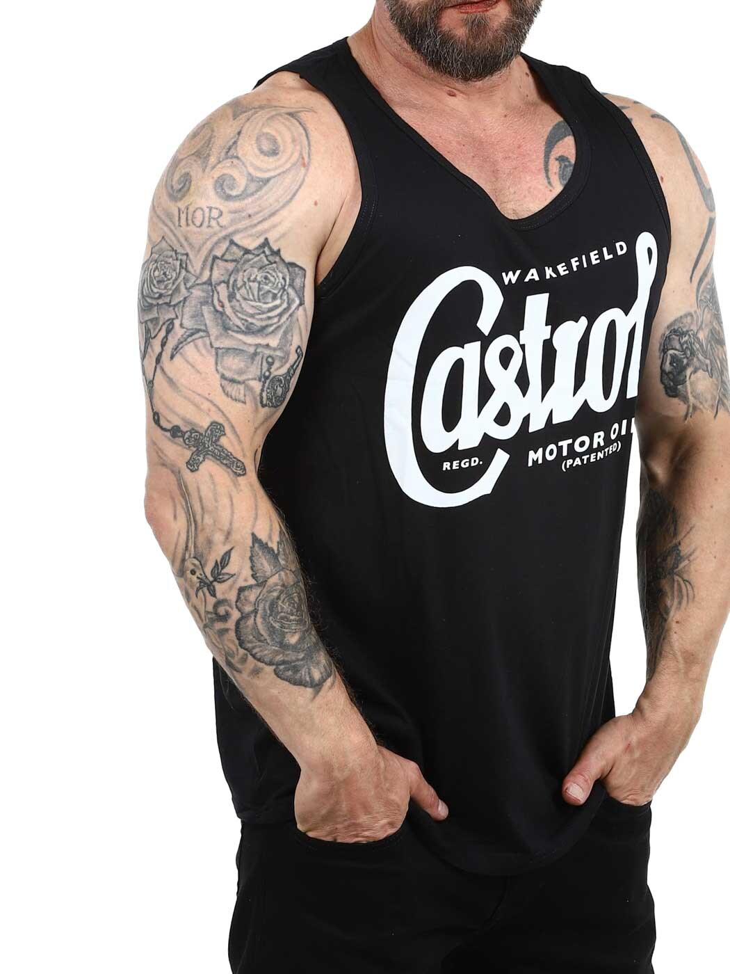 Denna svarta tanktop med klassiskt Castrol Motor Oil-tryck är ett måste för alla med passion för retro, racing och ikonisk design. Den stilrena vita loggan mot det svarta tyget skapar en snygg kontrast och en autentisk vintagekänsla. Perfekt för varma dagar, träning eller avslappnad streetwear.