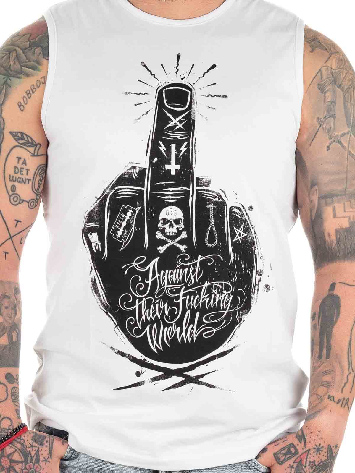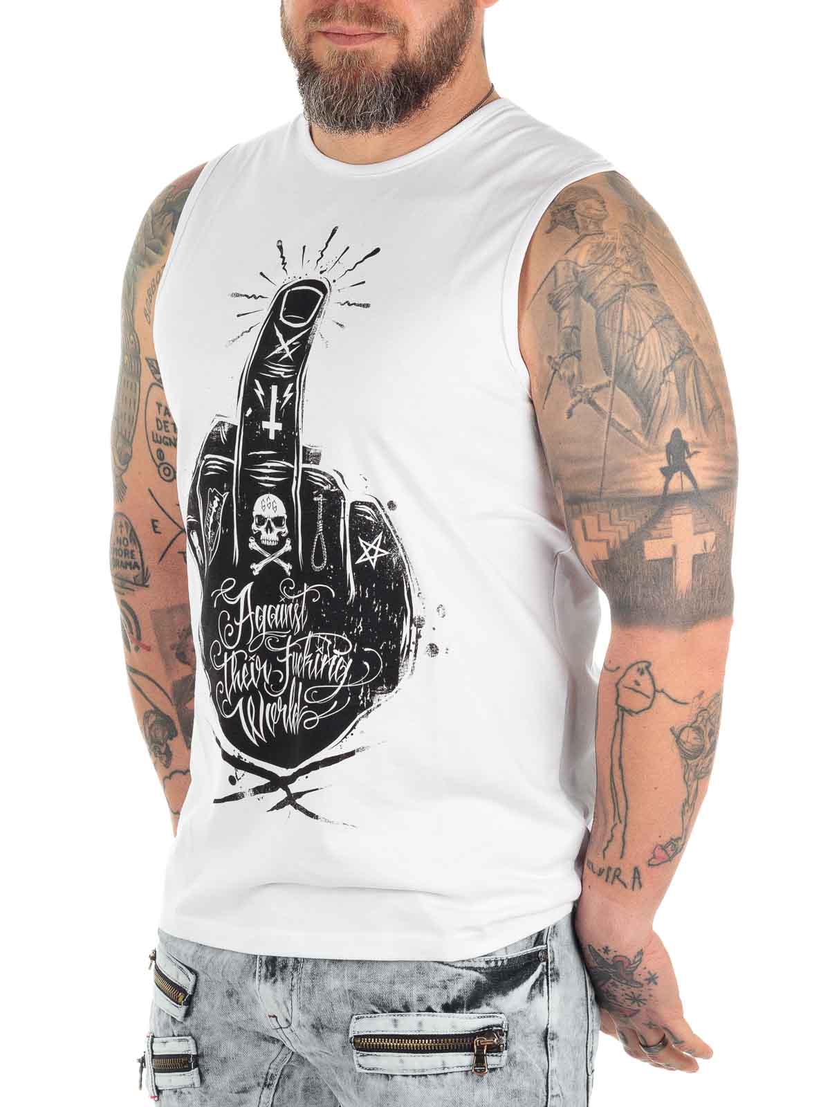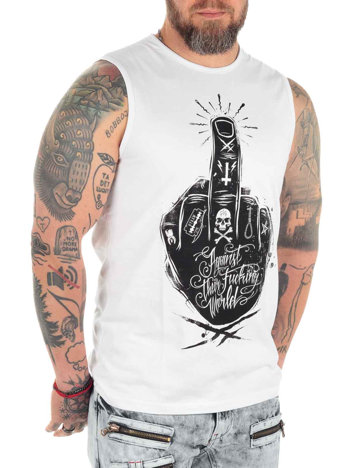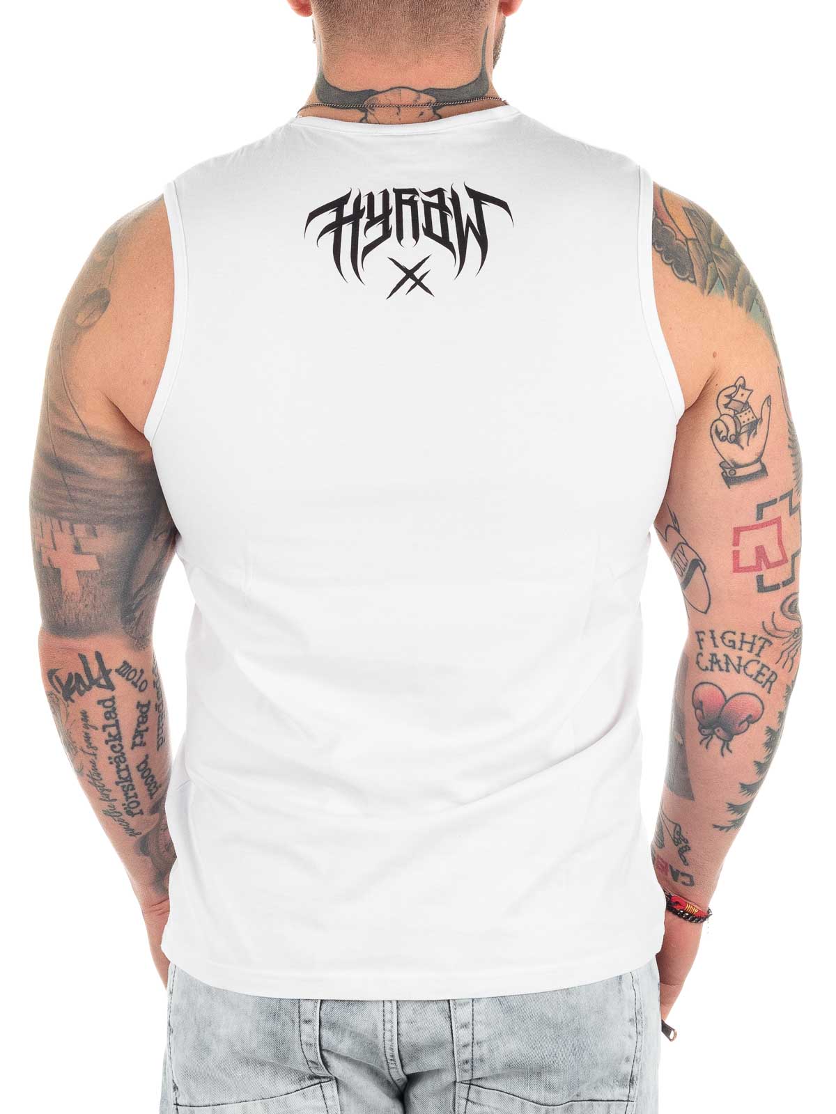 Vitt linne med tufft tryck och logga i kontrastfärg Klassisk modell med rundad halslinning. Tillverkad i 100% bomull