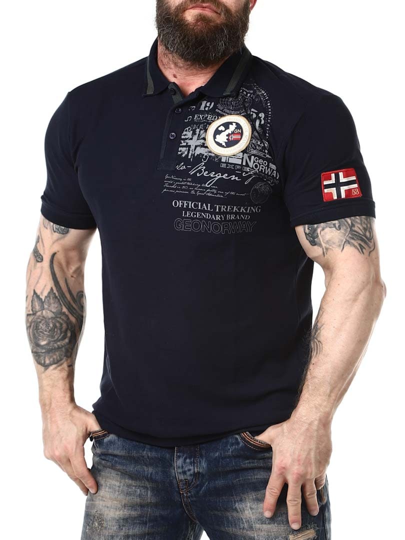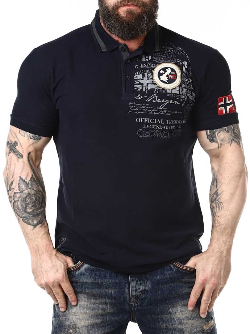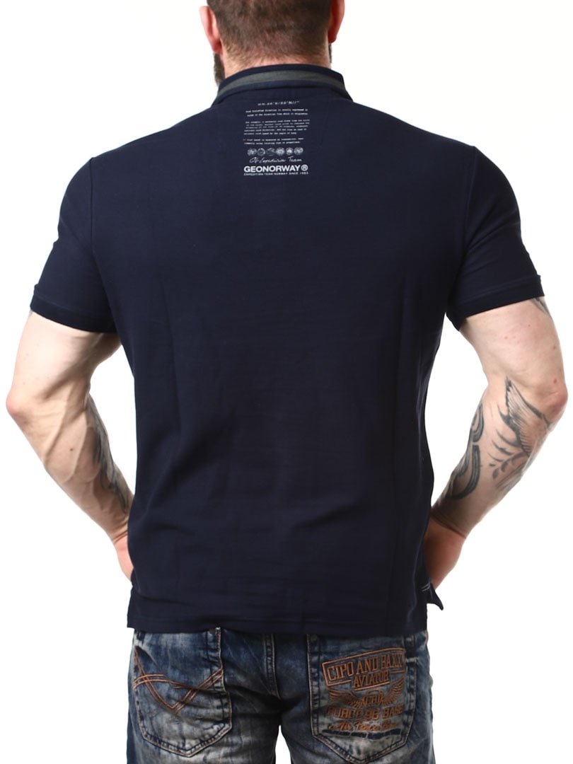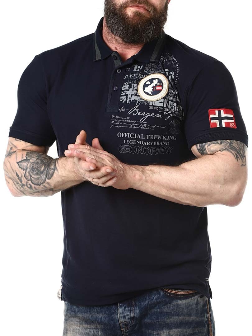 Kortärmad pike detaljerad med tryck, patches och logga. Den har knappar vid halsen och en kort slits i sidorna nedtill. Ribbad krage och ärmslut.