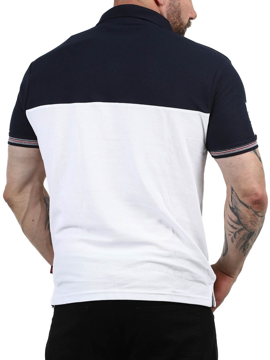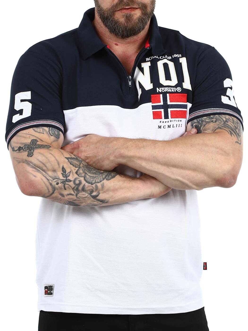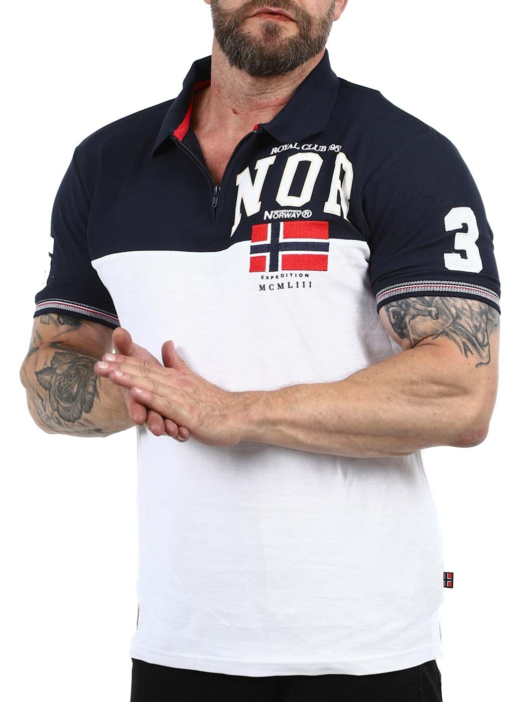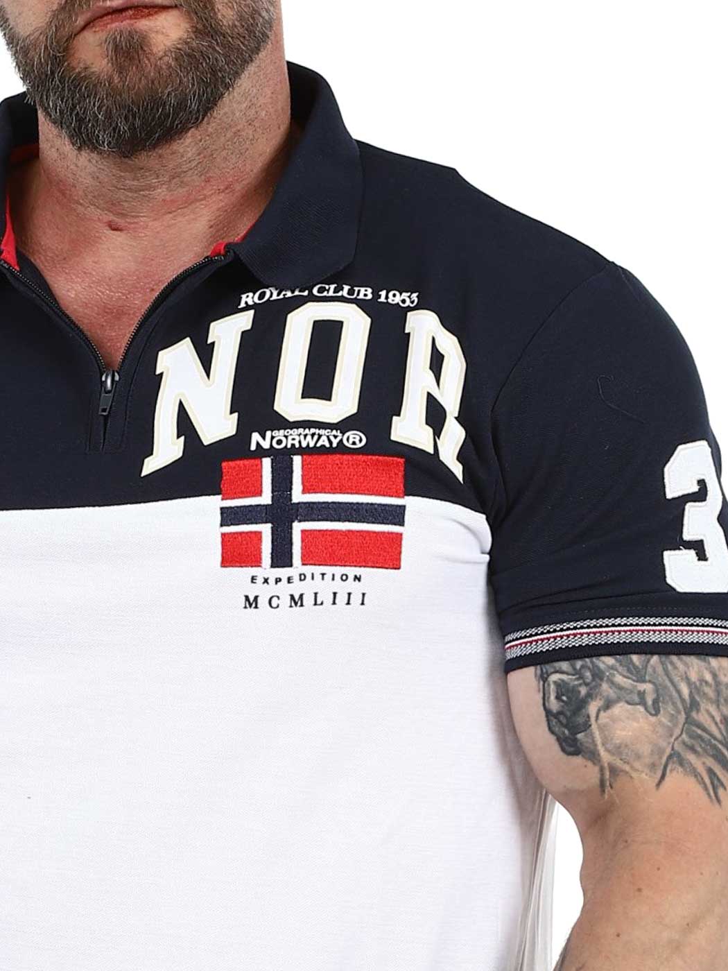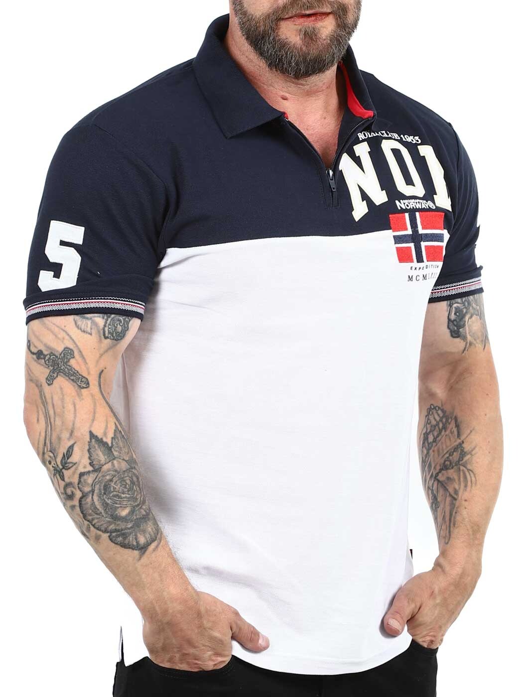 Stilren piké i vitt och mörkblått designad med tryck och patches. Den har krage med dragkedja som ger en sportig men stilren look och ribbade ärmslut. Tillverkad i 100% bomull.