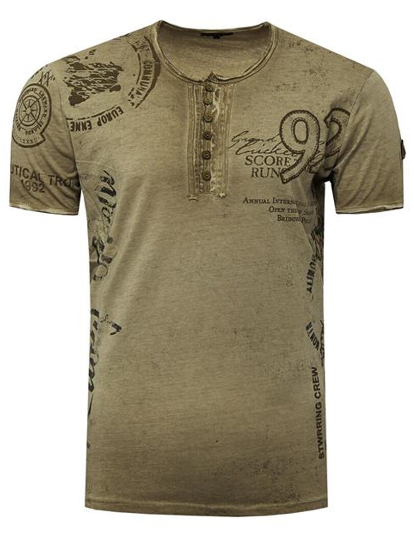 Grön t-shirt i mjuk bomull med silvrigt print på framsidan. Vanlig passform med generöst ringad hals som kan öppnas upp med träknappar och en diskret patch syns i brunt på vänster arm.