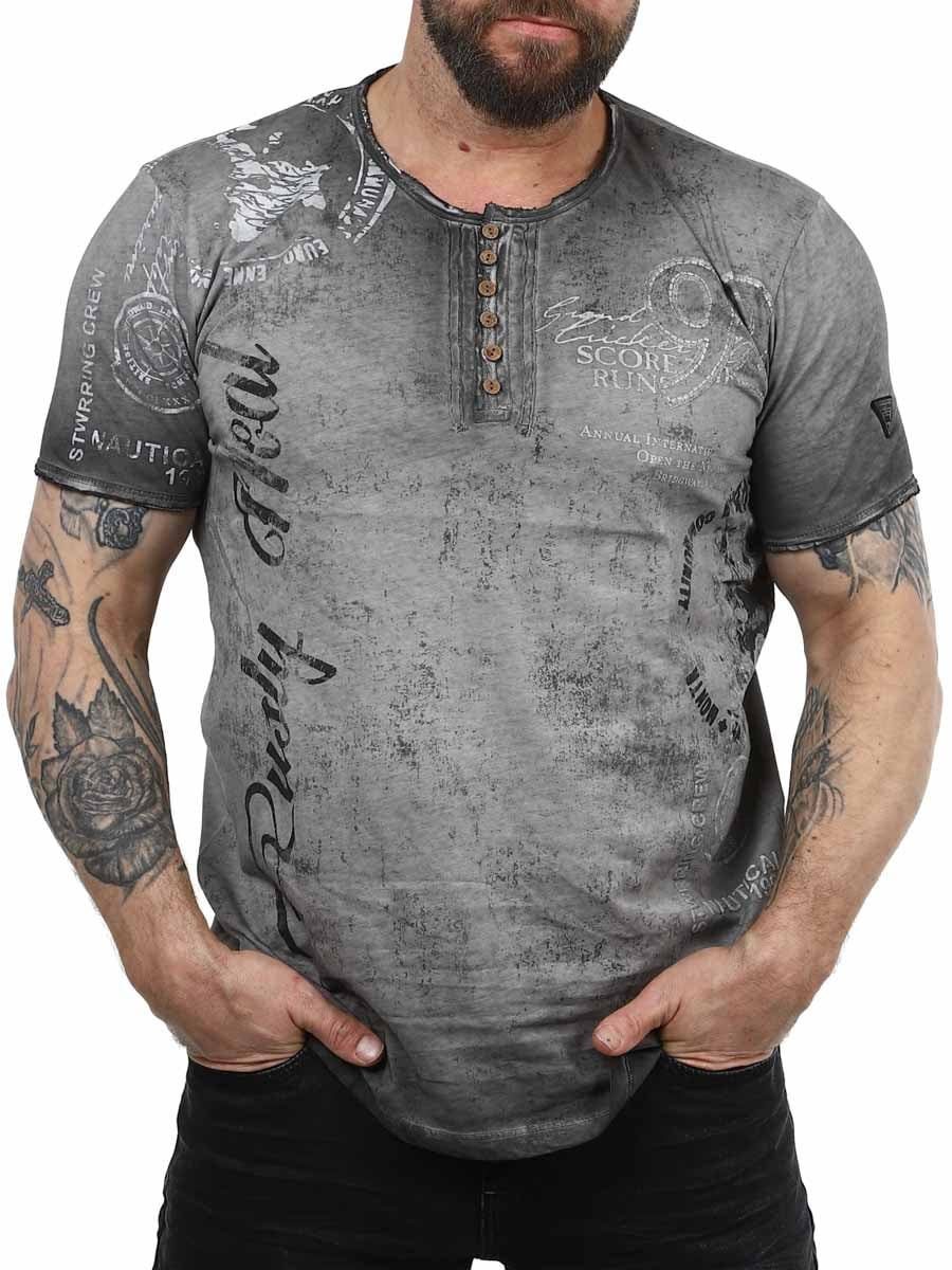 Mörkgrå t-shirt i mjuk bomull med silvrigt print på framsidan. Vanlig passform med generöst ringad hals som kan öppnas upp med träknappar och en diskret patch syns i brunt på vänster arm.