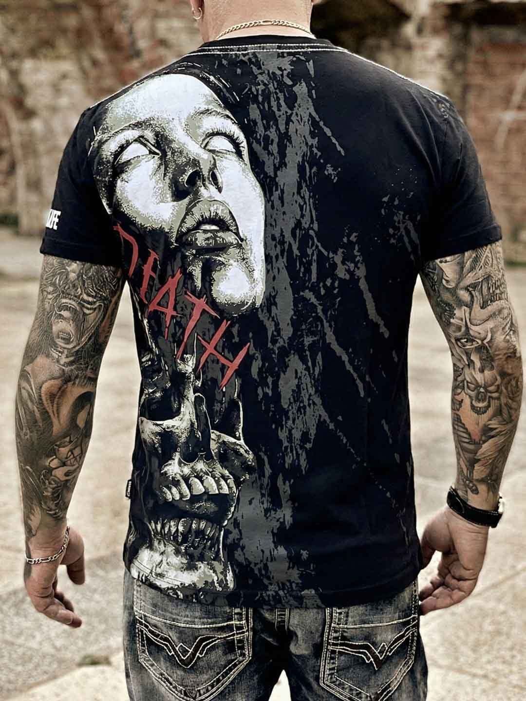 En t-shirt med stora grafiska dödskallemotiv på både fram- och baksidan, vilket ger en rå och uttrycksfull look. De mörka tonerna tillsammans med röda detaljer förstärker den rockiga känslan och gör den till ett självklart val för dig som vill sticka ut!