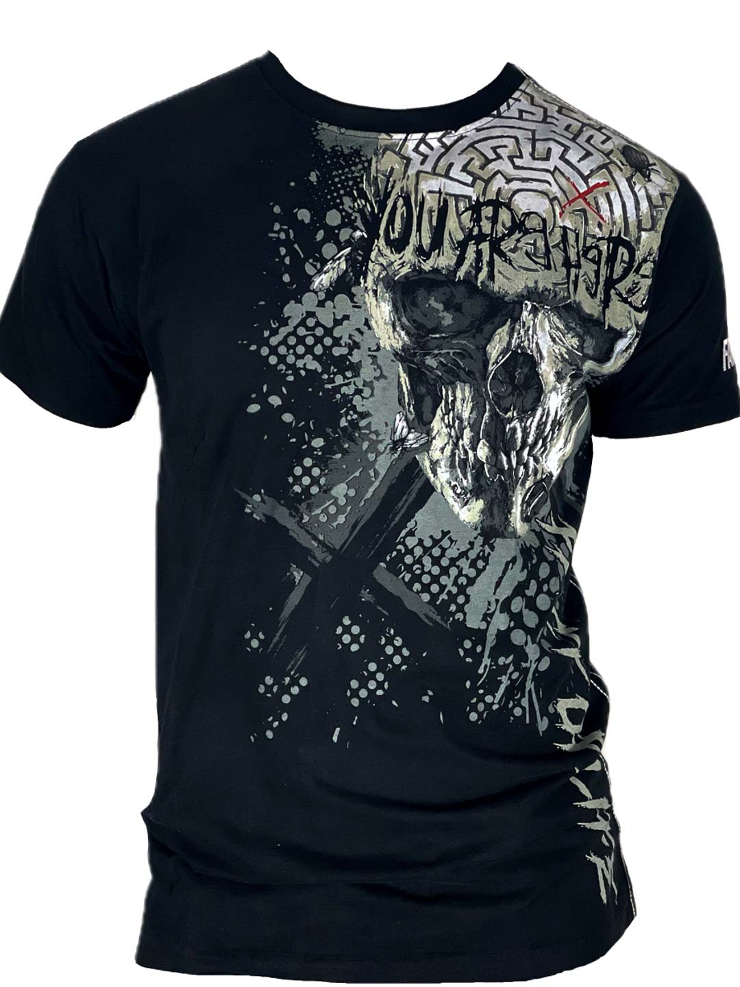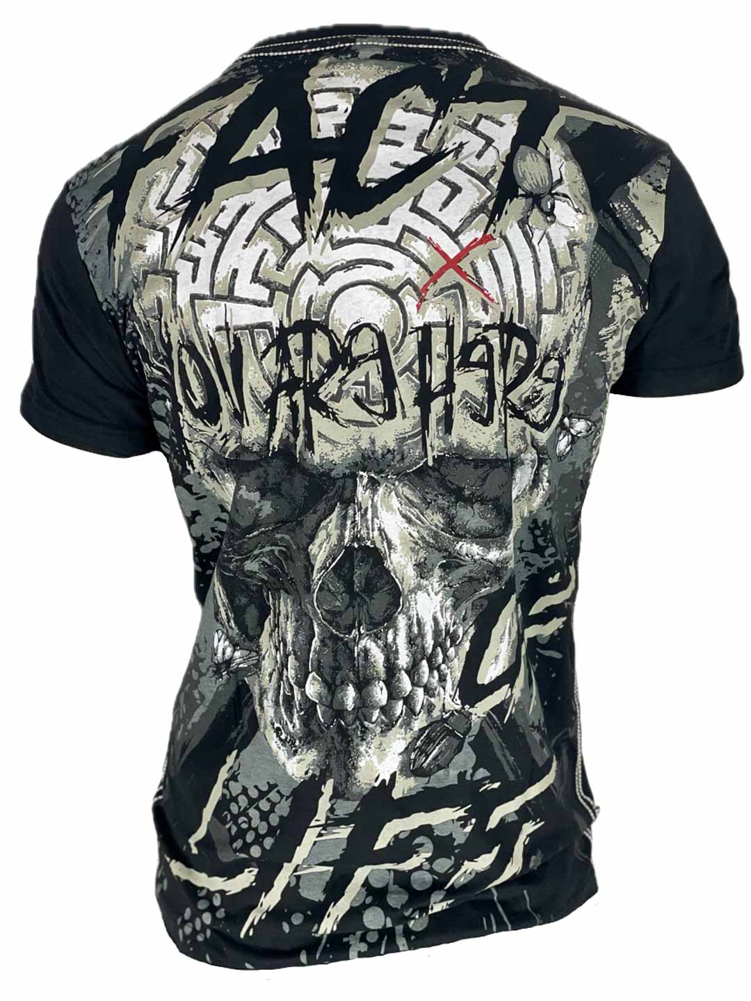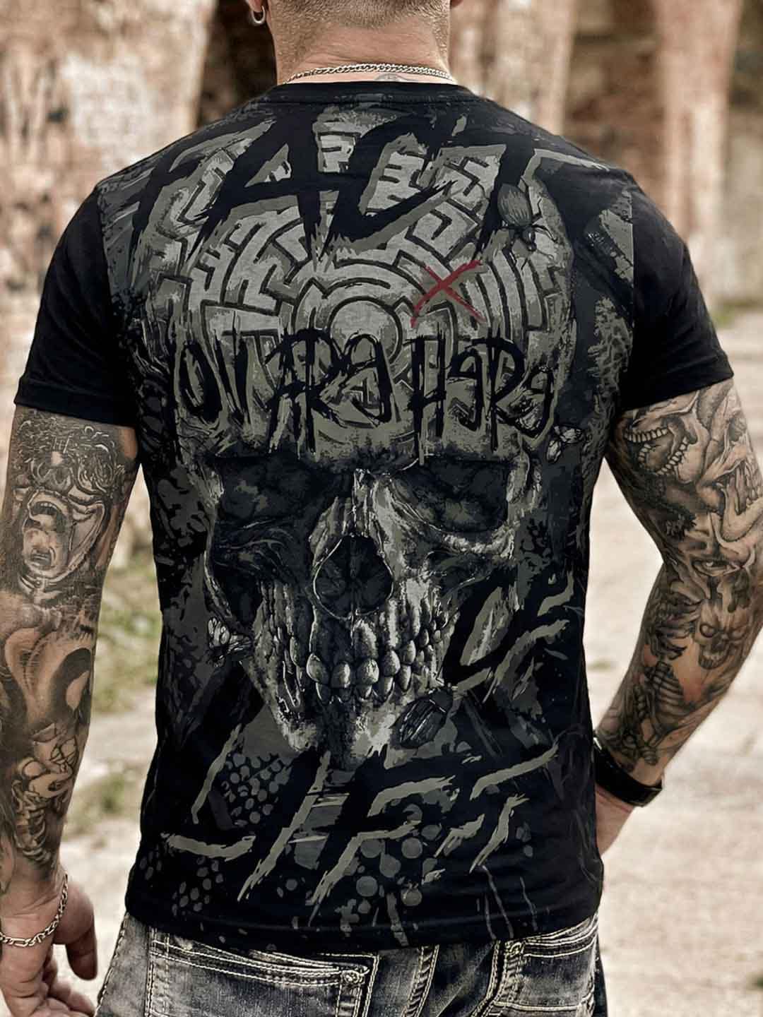 En uttrycksfull t-shirt med tydlig attityd och ett stort grafiskt dödskallemotiv som fortsätter över både fram- och baksidan. Stretchig modell med klassisk passform och rundad hals. Perfekt för dig som vill ha en t-shirt som verkligen sticker ut och sätter tonen för hela outfiten!