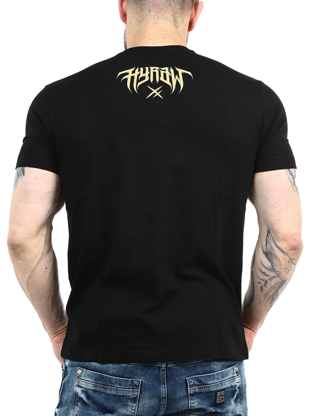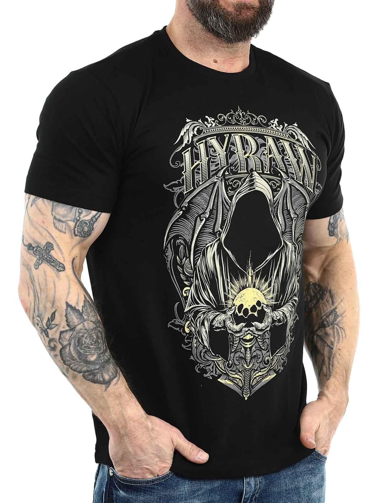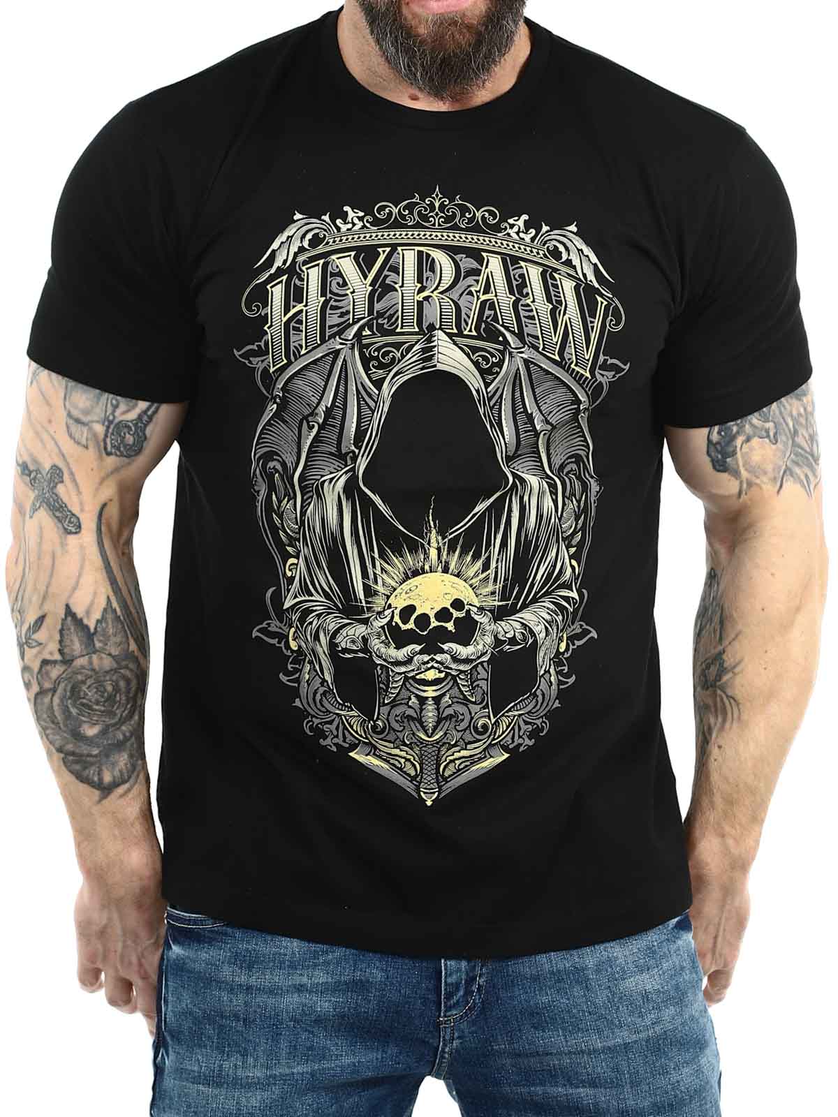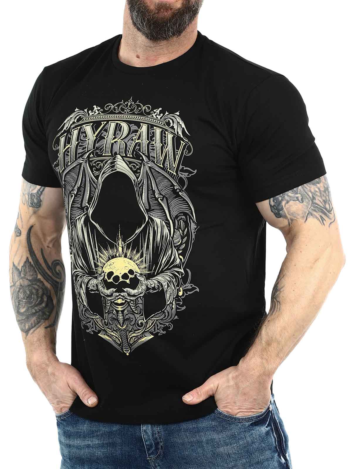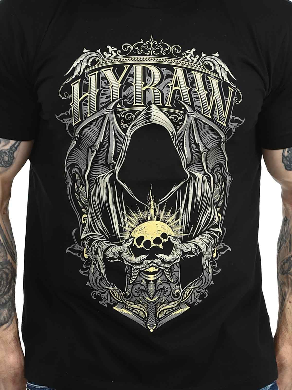 Svart t-shirt med ett kraftfullt tryck på bröstet i kontrastfärg samt en diskret Hyraw-logga tryckt bak i nacken. Den klassiska modellen med rund halsringning ger en bekväm passform och gör tröjan lätt att matcha med allt från jeans till streetwear-looks.