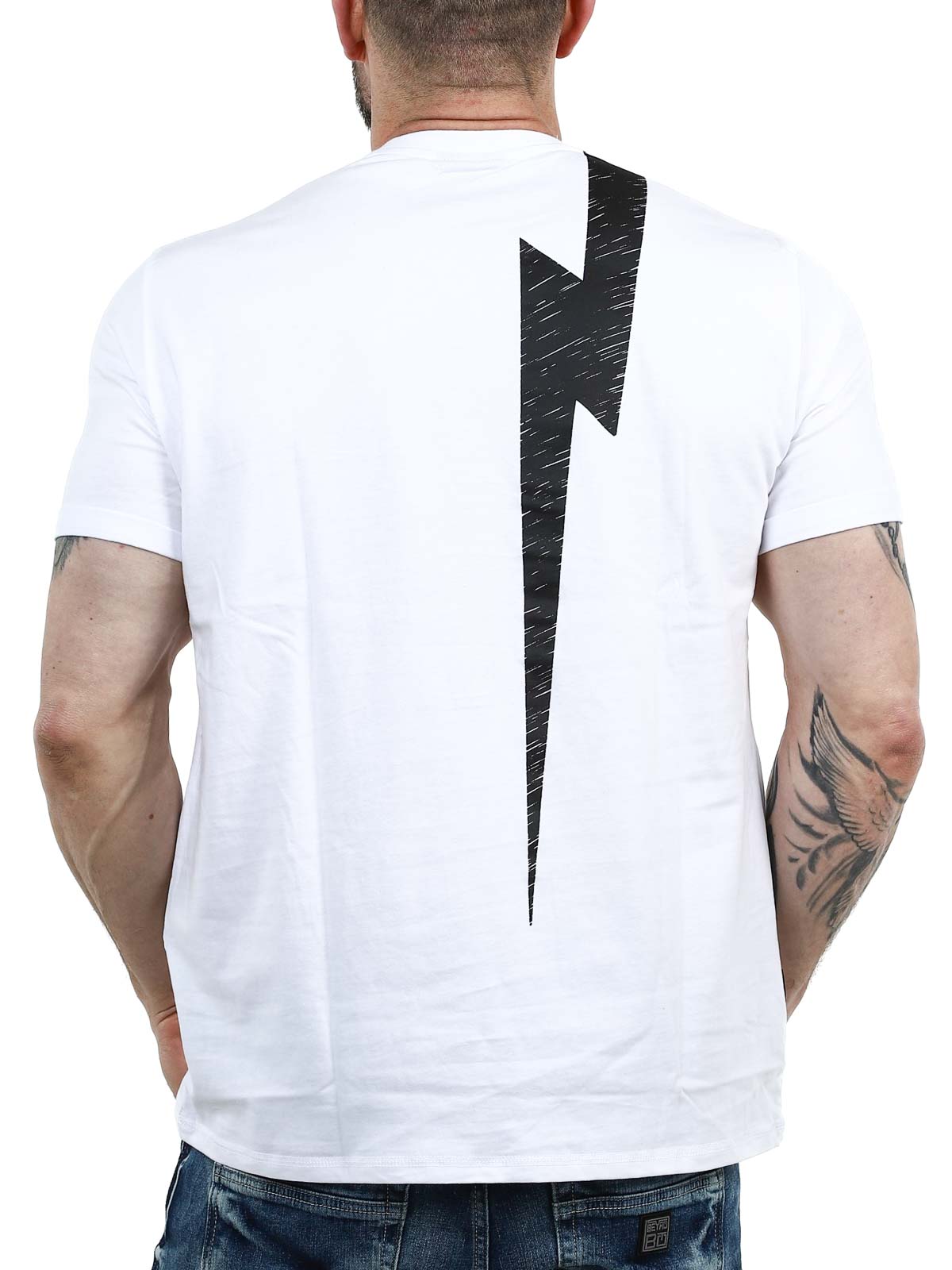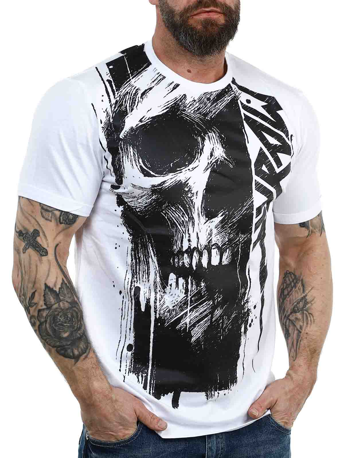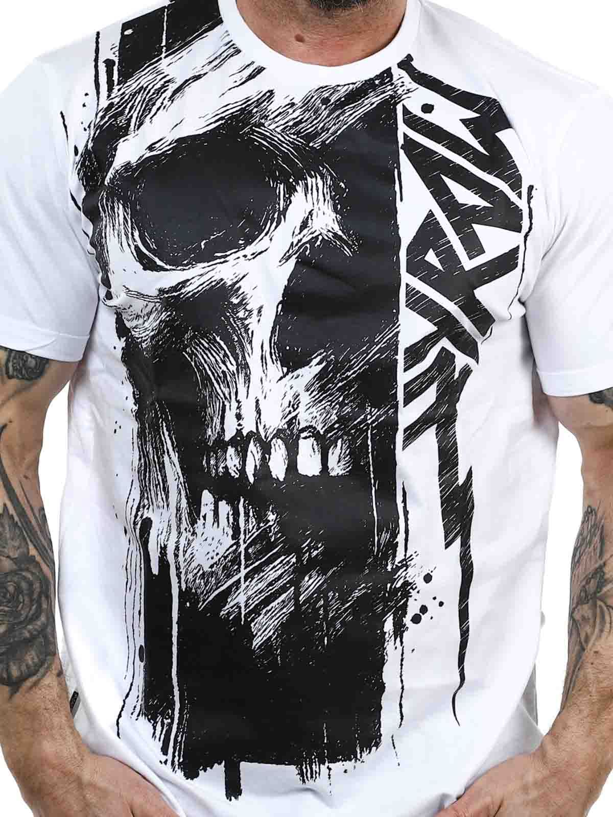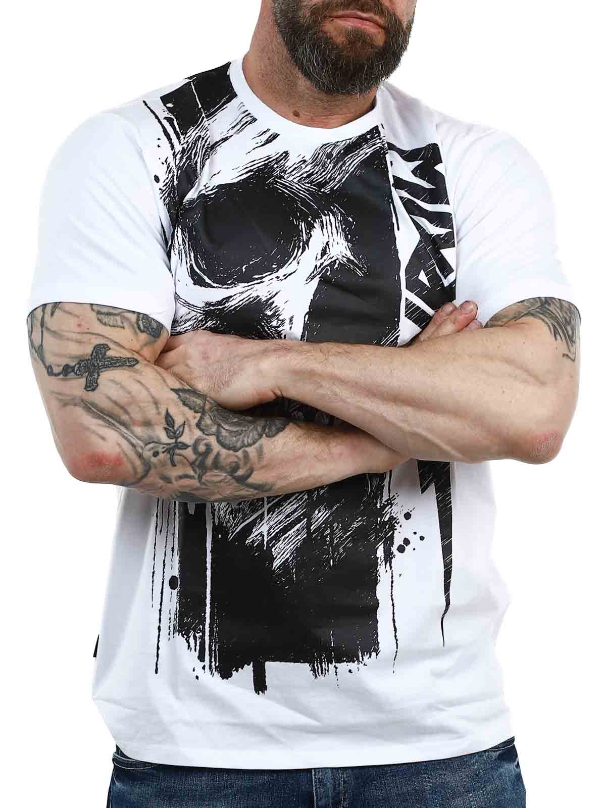 Lyft din vardagsstil med denna vita T-shirt som kombinerar en ren, tidlös bas med ett kraftfullt svart tryck. Den har ett stort motiv som täcker framsidan och fortsätter snyggt över ryggen för ett enhetligt och modernt uttryck. Tillverkad i 100% mjuk bomull och har en klassisk passform.