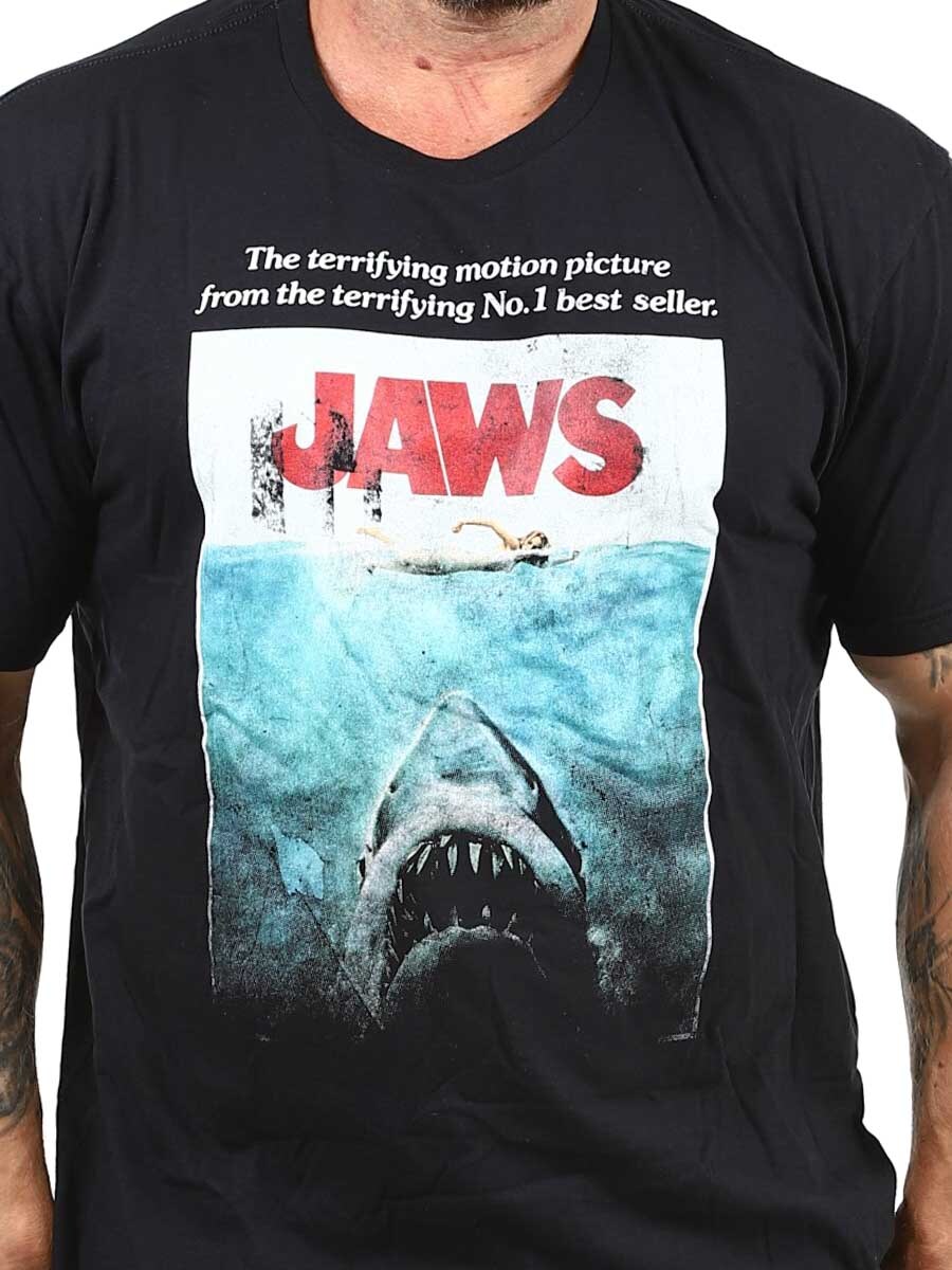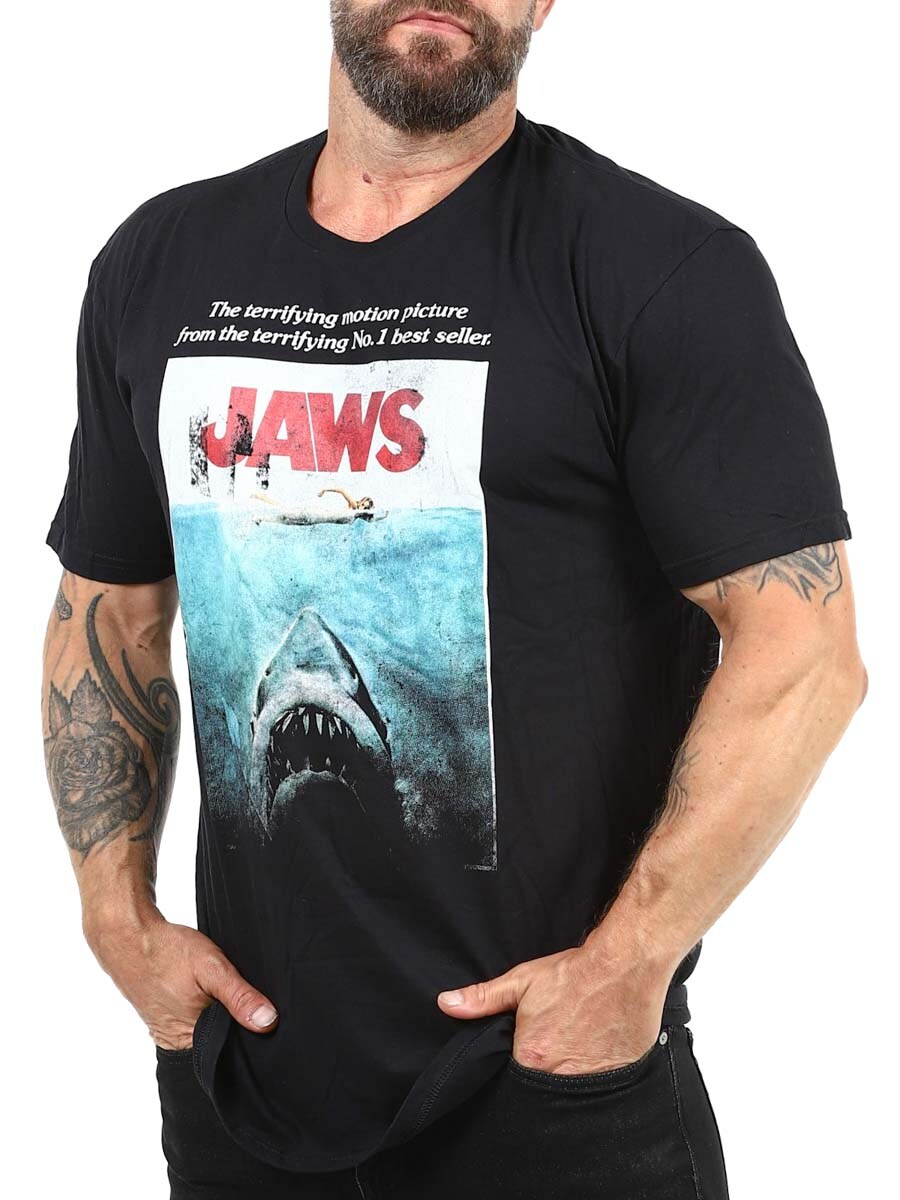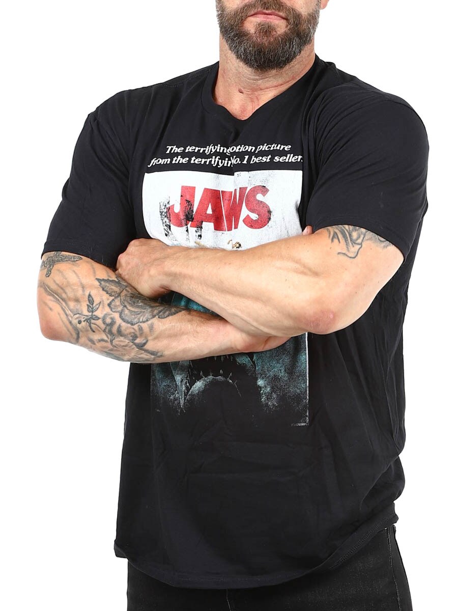 Snygg t-shirt designad med JAWS-tryck framtill. Med sin klassiska affischgrafik från Steven Spielbergs skräckfilmsklassiker är den här t-shirten ett måste för filmälskare och retrofantaster.