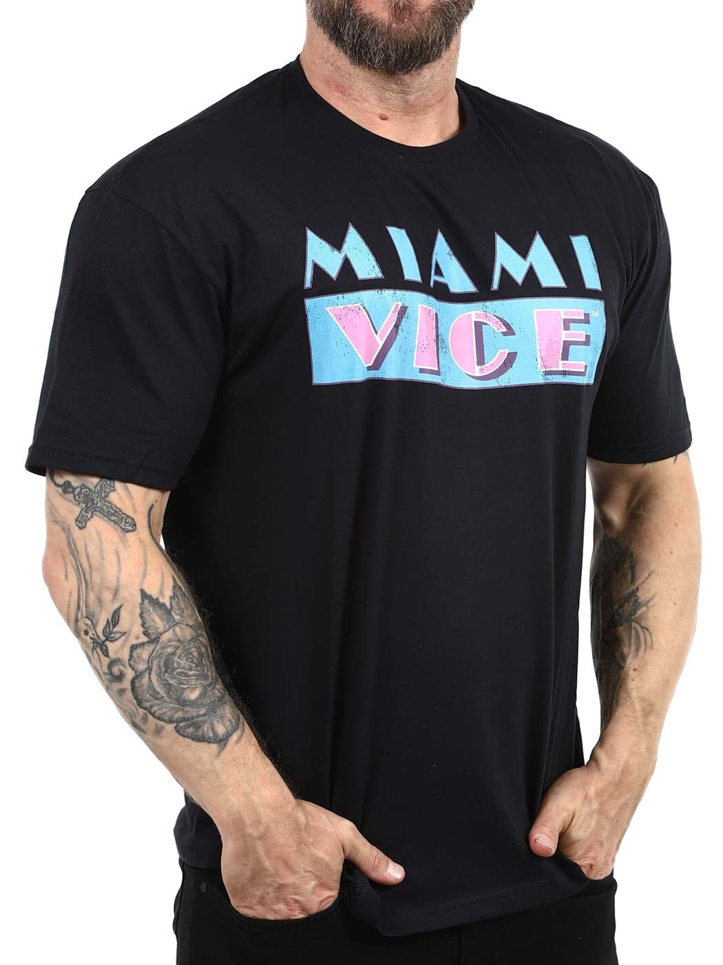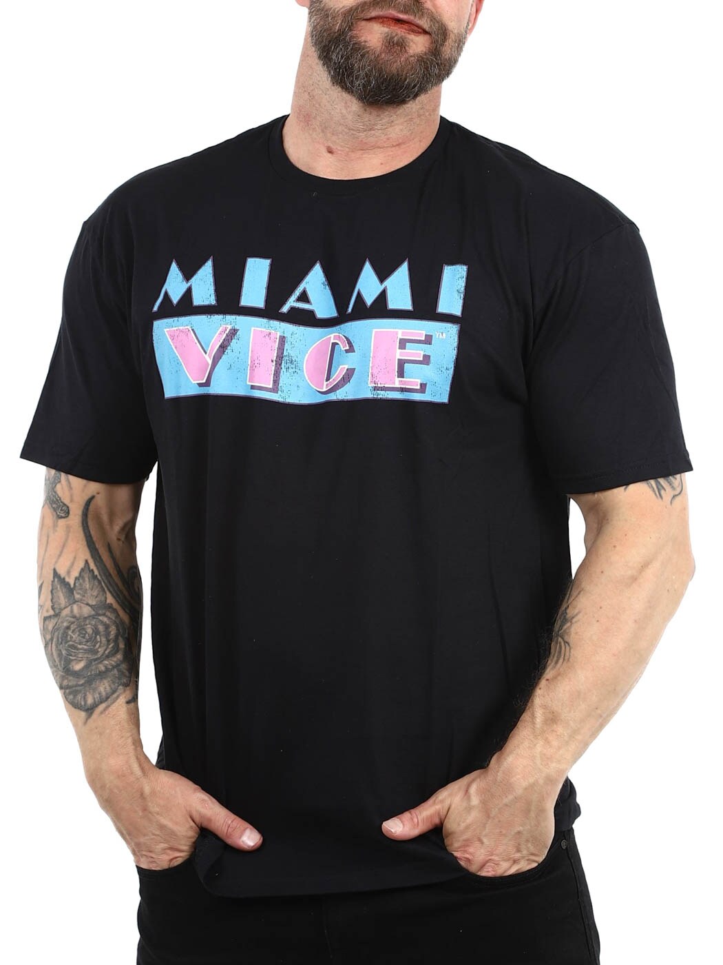 Känn vibben från den legendariska TV‑serien Miami Vice med denna t-shirt i retrostil. Det ikoniska Miami Vice‑logotypen är tryckt i en snyggt sliten look som ger en autentisk vintagekänsla.
