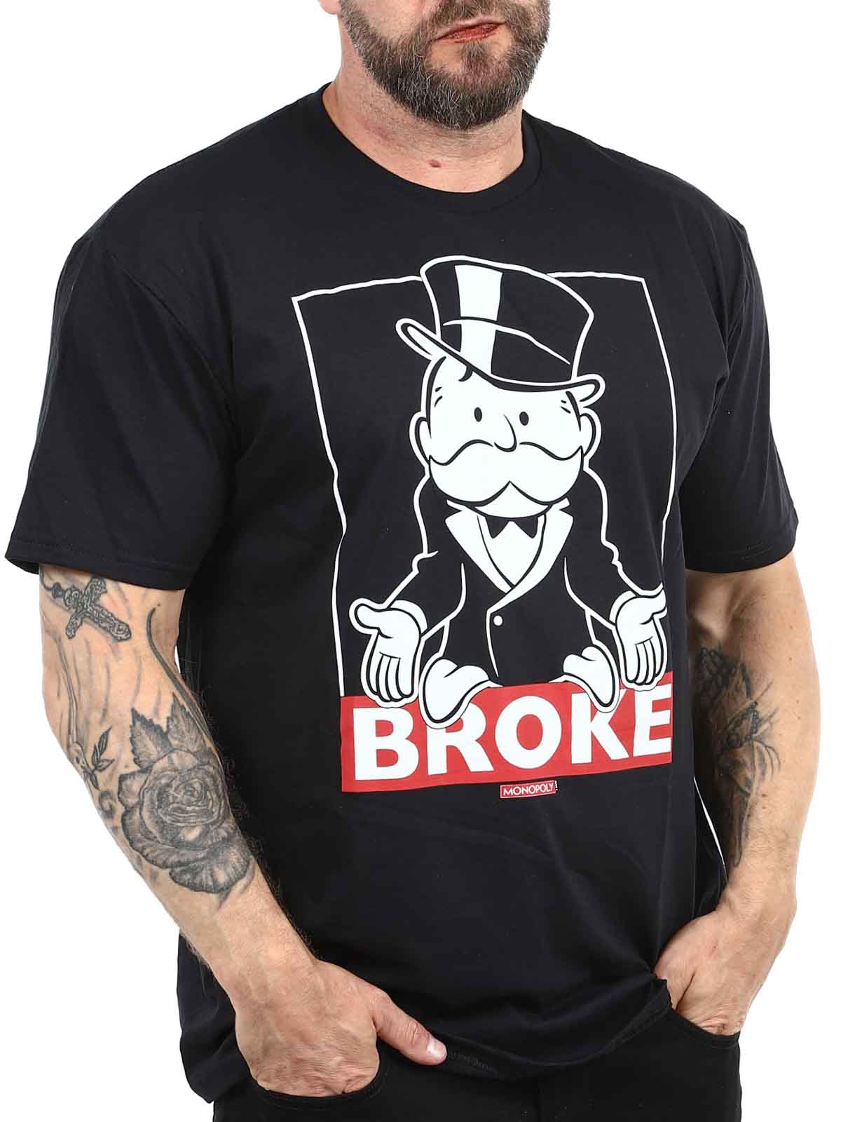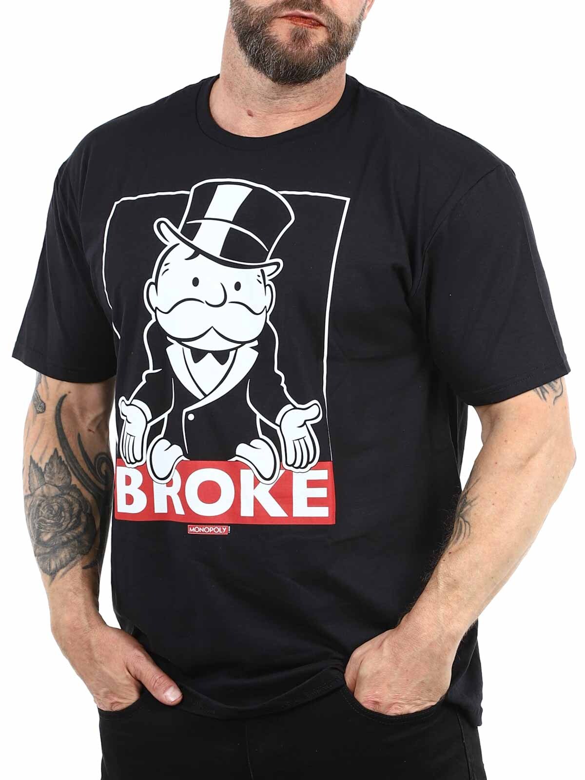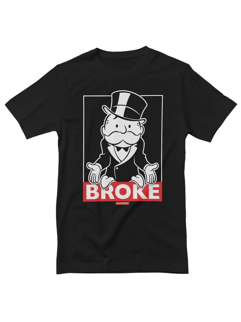 Svart t-shirt med Mr. Monopoly i sin klassiska "bankrutt"-pose. Med texten "BROKE" bjuder den på smart och självironisk humor. Ett perfekt plagg för både brädspelsfantaster och de med en vass känsla för sarkasm.