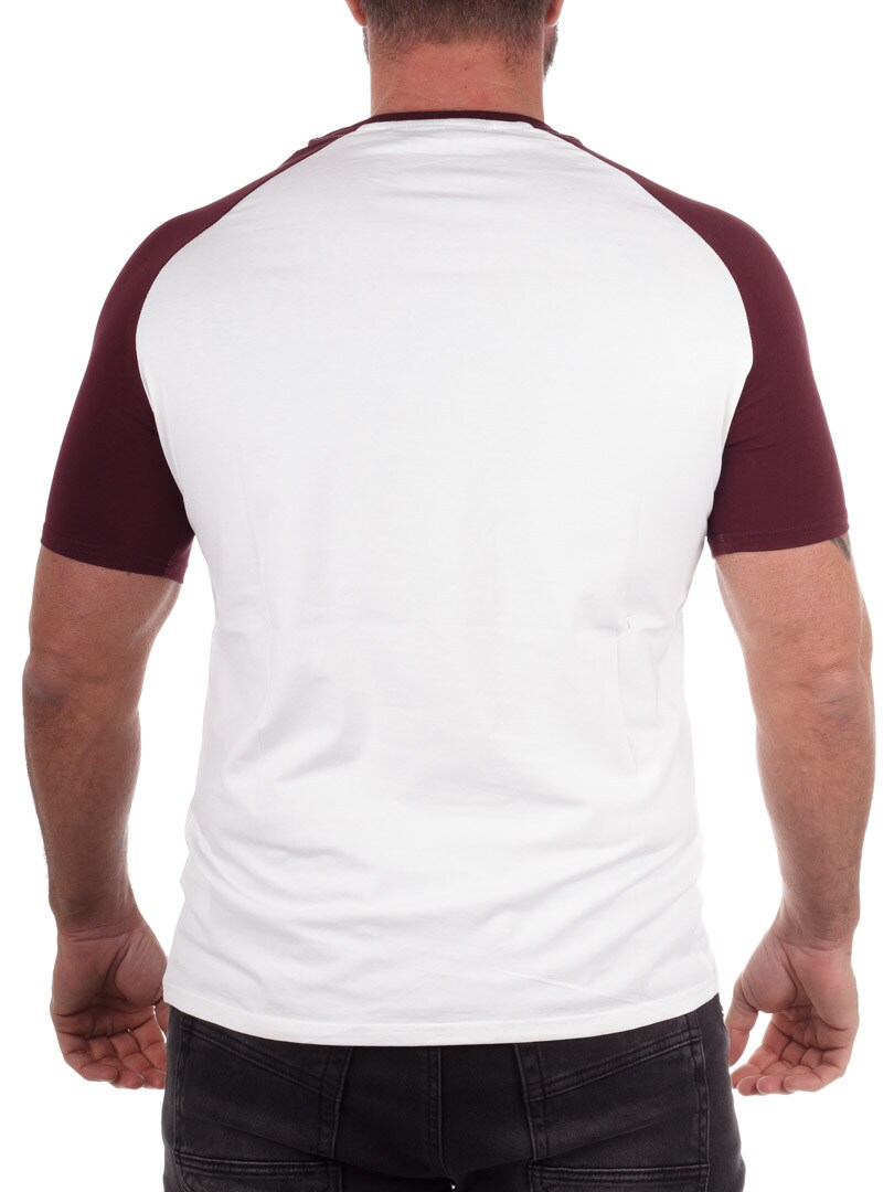 Stilren t-shirt i vit med vinröda ärmar och en svart broderad logga på bröstet. Ett perfekt plagg för dig som vill kombinera komfort, sportig känsla och modern design. T-shirten är tillverkad i ett mjukt och stretchigt material som följer dina rörelser utan att tappa formen.