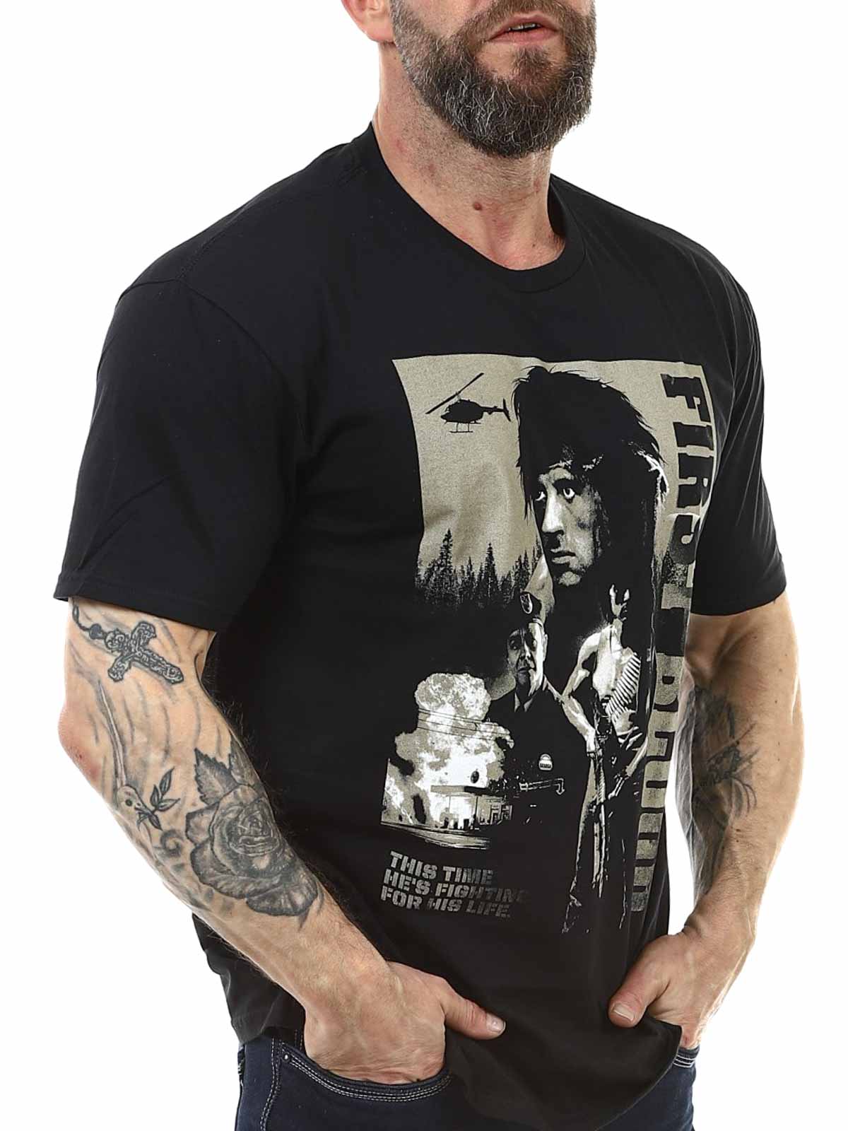 Hylla en av actionfilmens mest ikoniska karaktärer med denna First Blood‑inspirerade T‑shirt där John Rambo slåss för överlevnad och frihet i en tuff och oförglömlig 80‑talsactionhistoria. Trycket ger en rå, nostalgisk känsla och passar perfekt för dig som gillar actionklassiker och kultfilmer. Den har klassisk passform och rundad halsöppning.