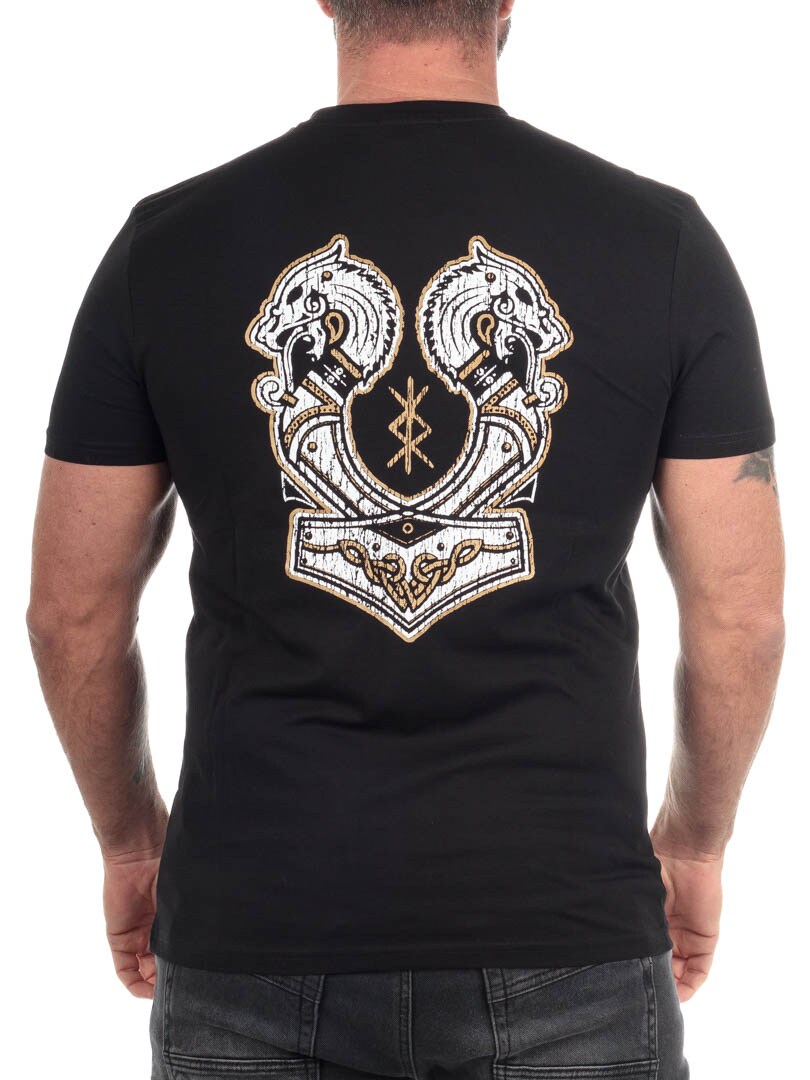 Denna t-shirt erbjuder den perfekta balansen mellan attityd och stil tack vare sin genomtänkta design. Ryggen domineras av ett stort, iögonfallande motiv med drakhuvuden och Mjölner, medan bröstet pryds av en subtil runa i guld för en diskretare look framifrån. Tröjan har en klassisk passform och en ribbad, rund halsringning som gör den bekväm att bära hela dagen. Den är tillverkad i 100% bomull och finns endast att köpa hos RockDenim.