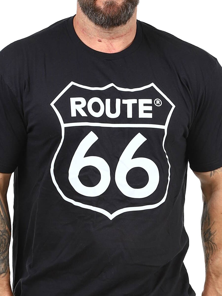 Denna svarta t-shirt pryds av ett ikoniskt Route 66-tryck på bröstet,en hyllning till den legendariska amerikanska motorvägen och känslan av frihet på öppna vägar. T-shirten har rundad halsöppning och är tillverkad i mjuk bomull.