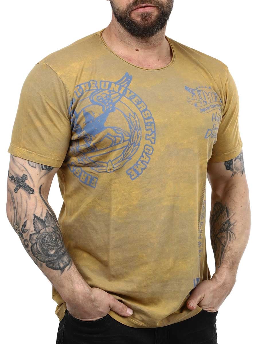 Bekväm t-shirt i ljusbrunt med urtvättad effekt. Textprint och tryck klär framsidan i en ljusare gråfärg och den har en diskret tygpatch med logga nertill på vänster sida. Rak modell med mycket stretch och rundad hals.