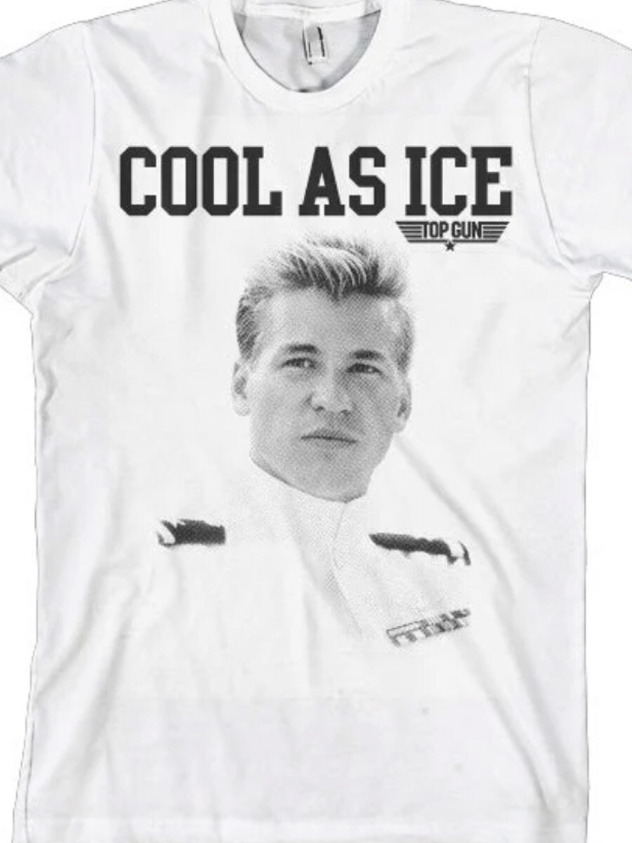 Top Gun-inspirerad T-shirt med ett ikoniskt motiv av pilotkaraktären “Iceman”. Trycket med texten “Cool As Ice” fångar den självsäkra attityden från den klassiska 80-talsfilmen och ger T-shirten en tydlig retro-känsla. Den har klassisk passform och rundad halsöppning.