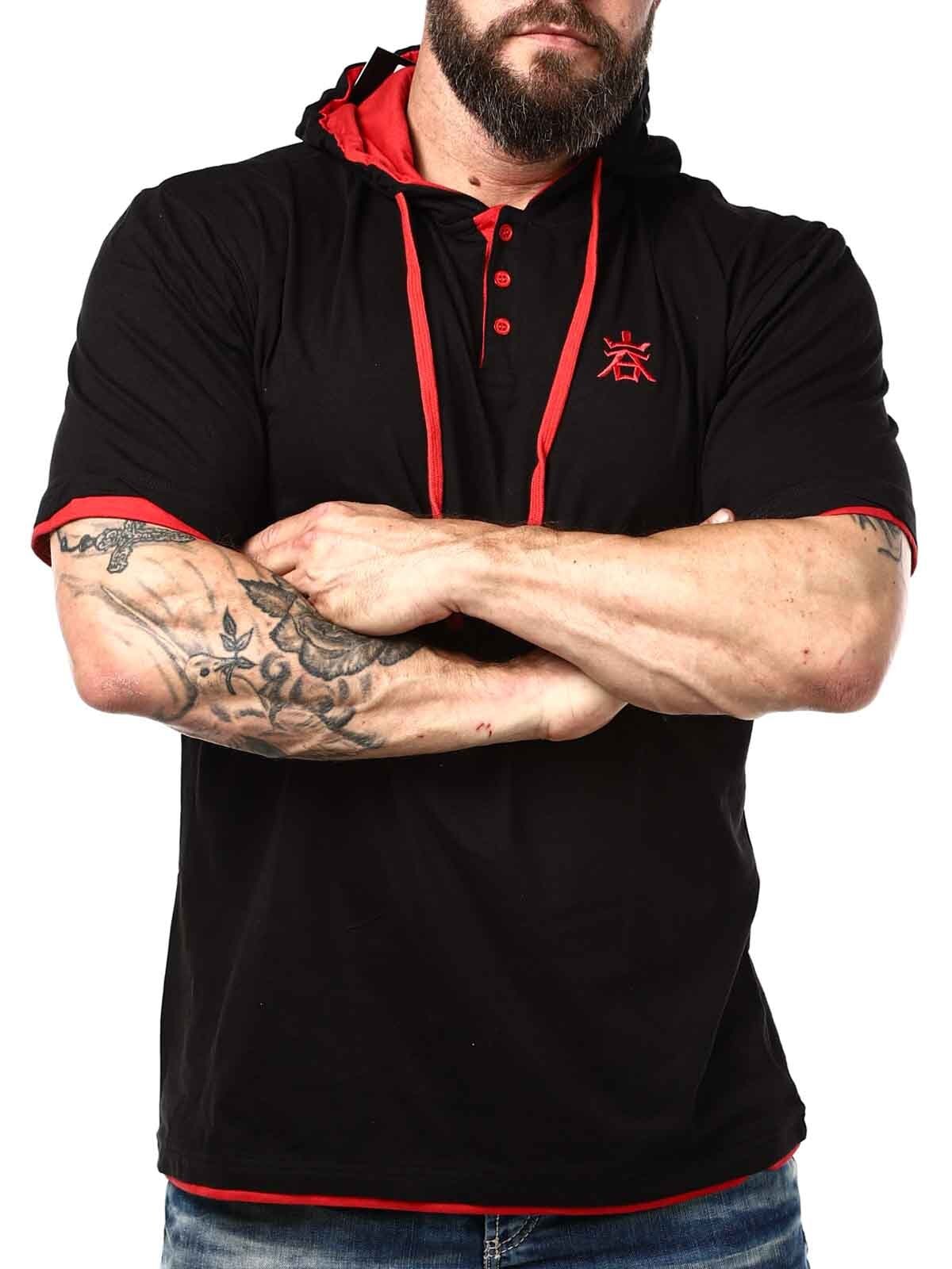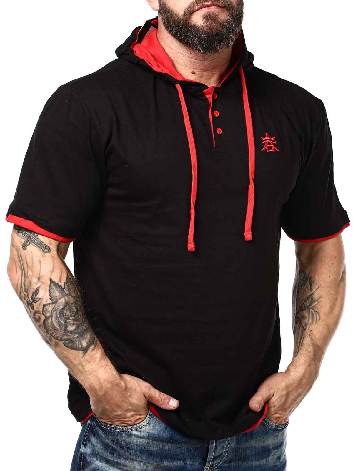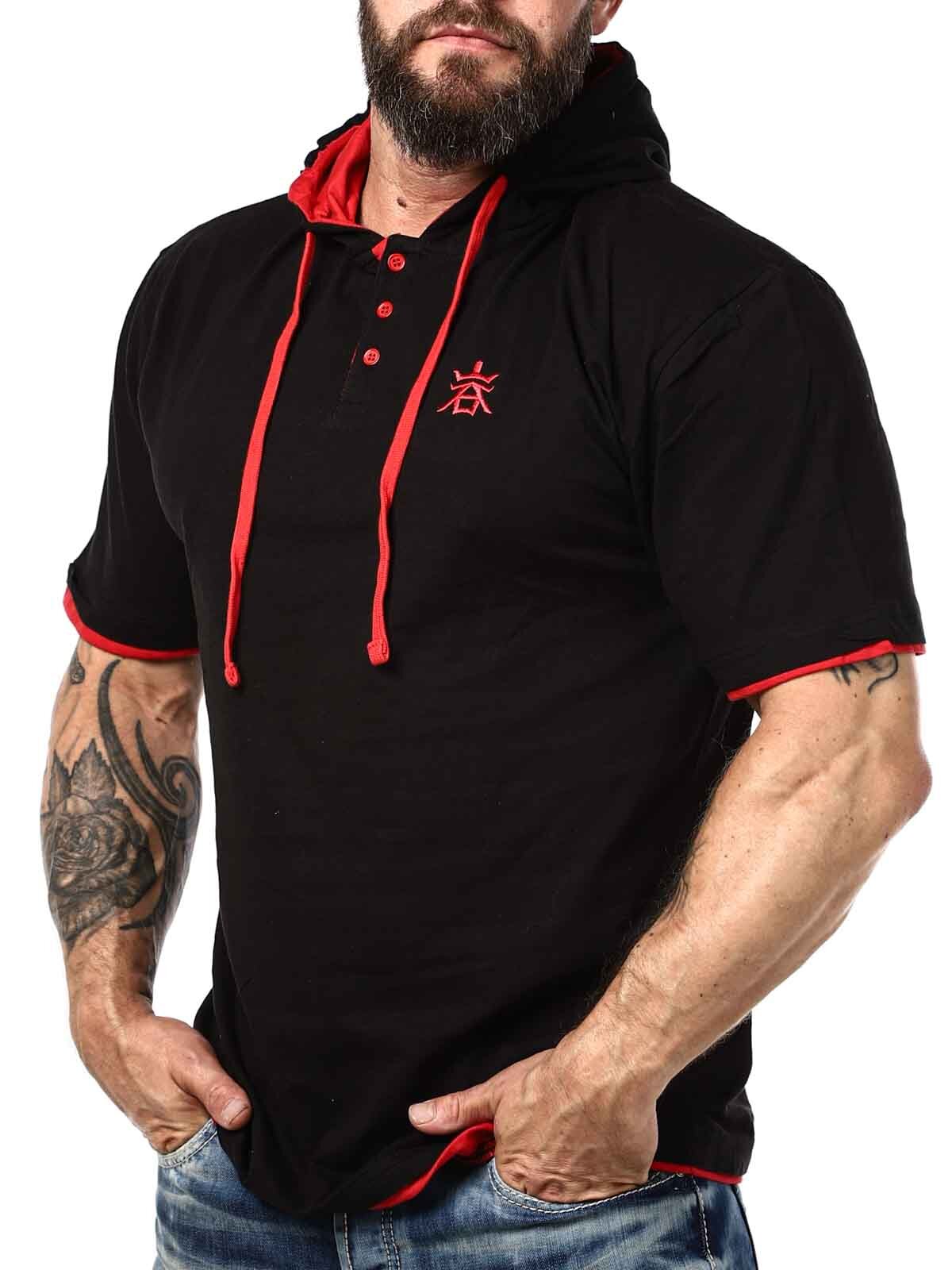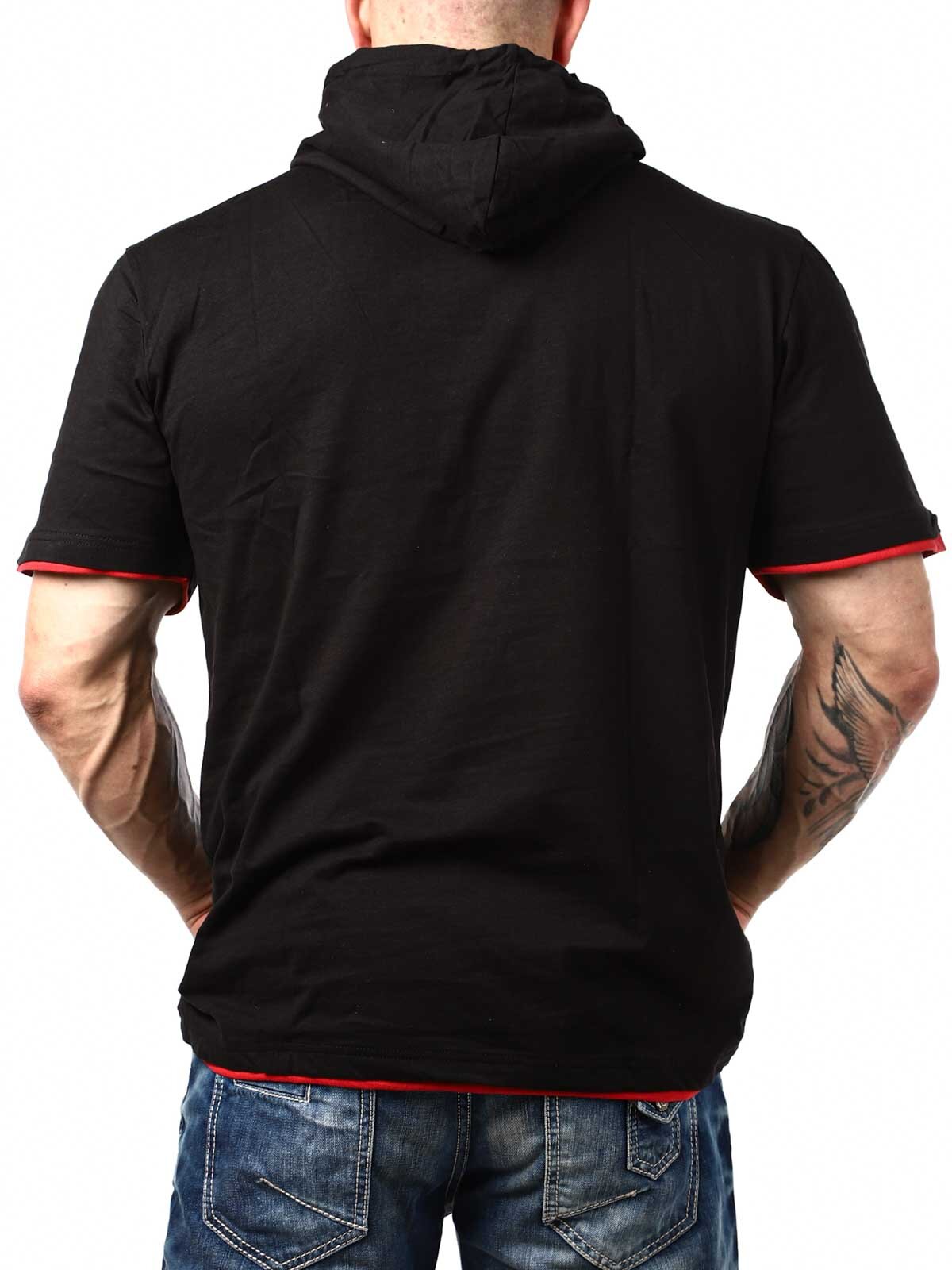 Svart t-shirt med röda detaljer. Den har klassisk passform och är designad med huva och knappöppning framtill. Denna unika t-shirt hittar du endast hos RockDenim!