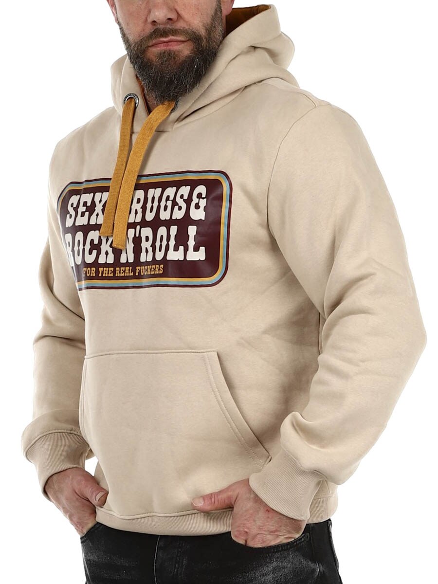 Mjuk och bekväm huvtröja i en behaglig beige färg. Tröjan har borstad insida, ficka på magen och ribbade muddar i avsluten. Designen kompletteras av en mjuk huva med matchande dragsnören som ger en extra touch av attityd. Det här är hoodien för dig som älskar rock ’n’ roll-attityd, personlig stil och ett plagg som speglar din egen livsyn.