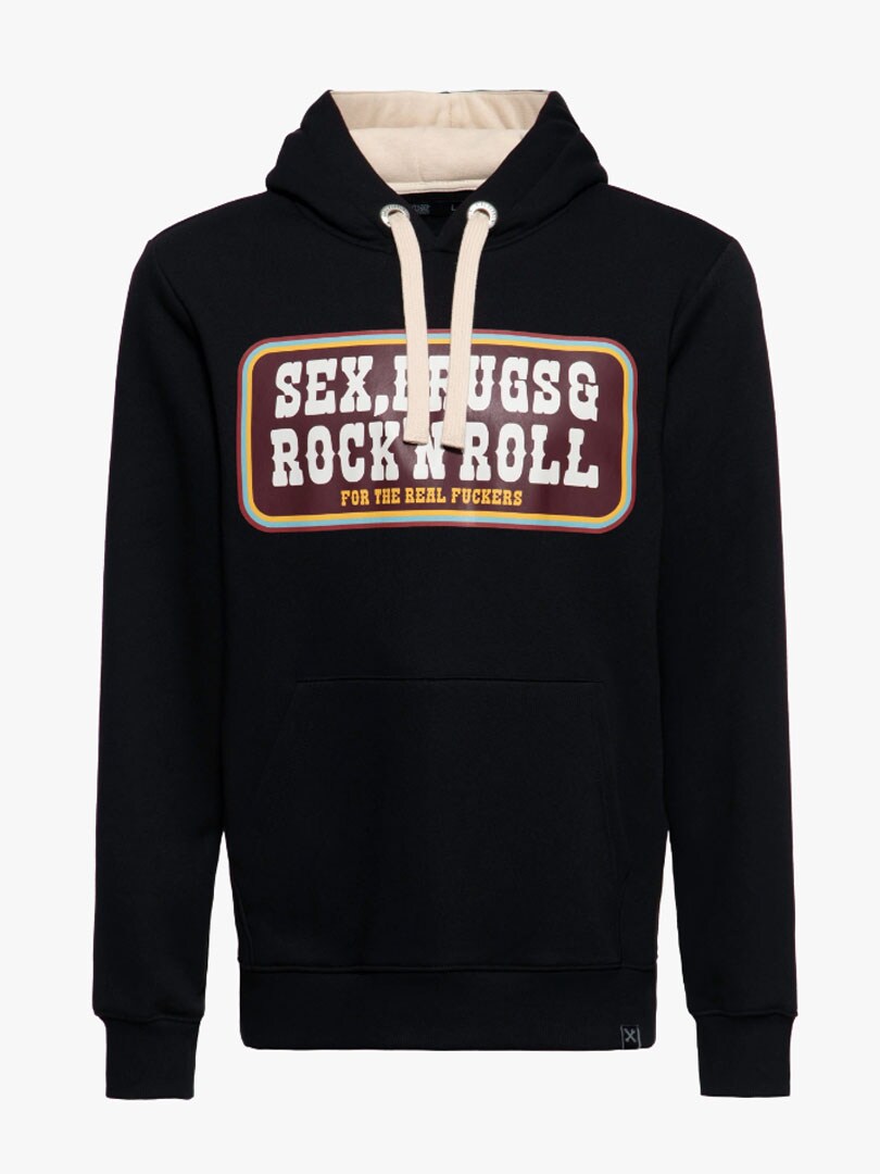 Mjuk och bekväm huvtröja i en svart färg. Tröjan har borstad insida, ficka på magen och ribbade muddar i avsluten. Designen kompletteras av en mjuk huva med matchande dragsnören som ger en extra touch av attityd. Det här är hoodien för dig som älskar rock ’n’ roll-attityd, personlig stil och ett plagg som speglar din egen livsyn.