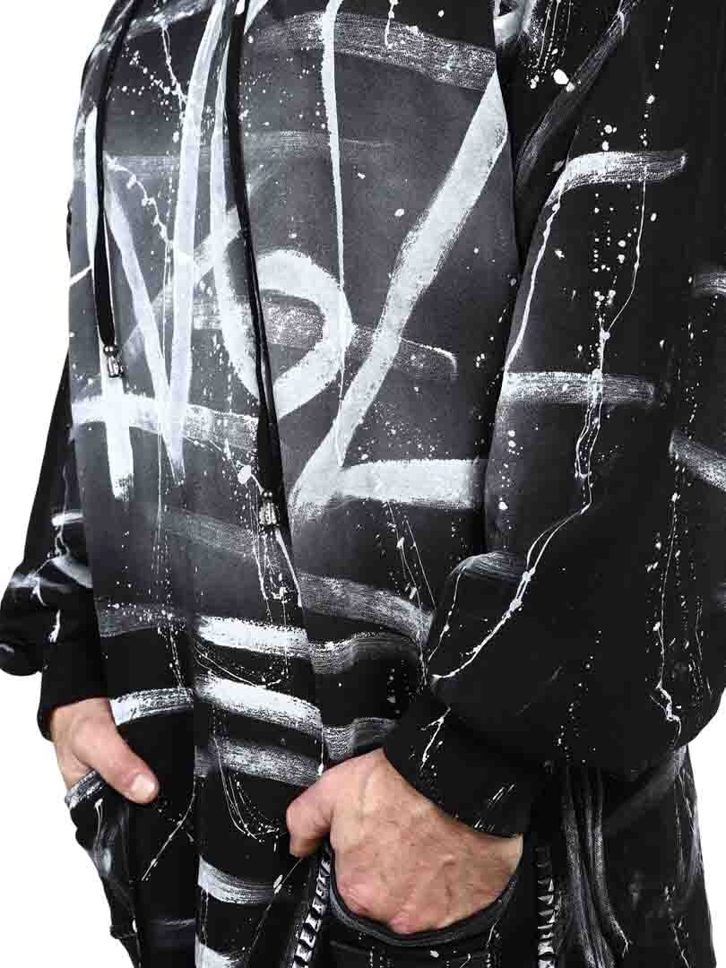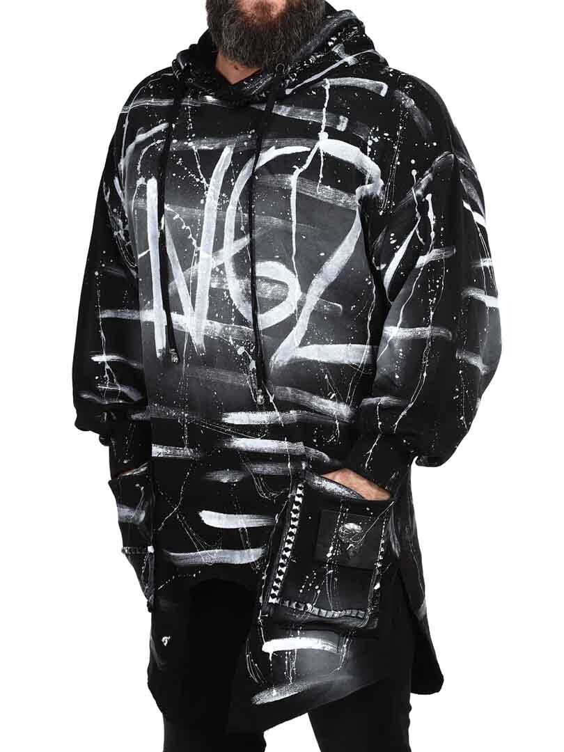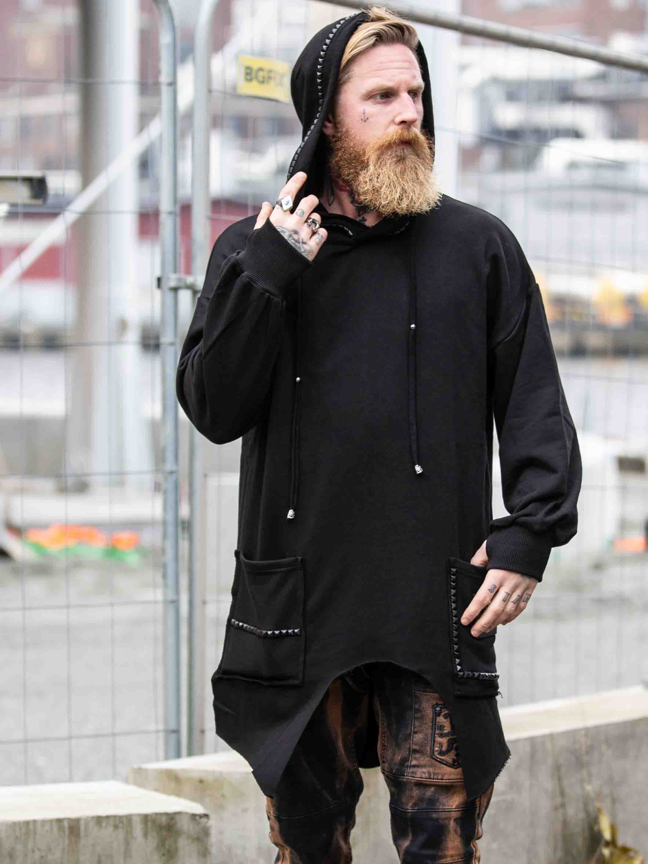 Hoodie i en längre modell med utskärning nedtill. Detaljerad med svarta nitar, patch och skräddad logga baktill. Den har huva med snörning och två öppna framfickor.