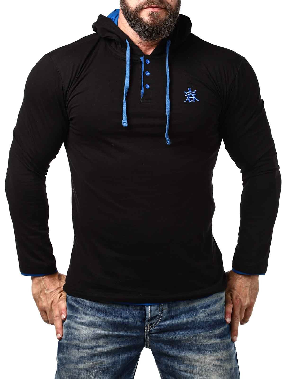 Svart longsleeve med blåa detaljer. Den har klassisk passform och är designad med huva och knappöppning framtill. Denna unika longsleeve hittar du endast hos RockDenim!