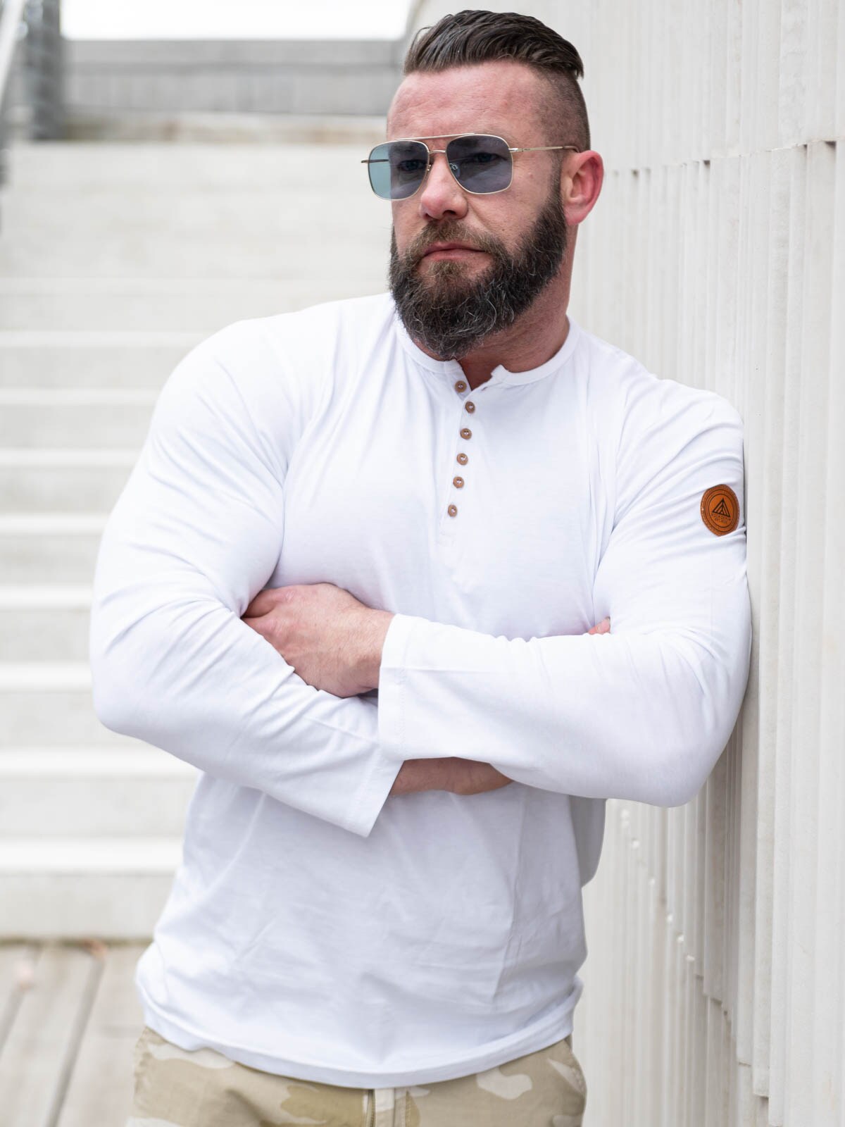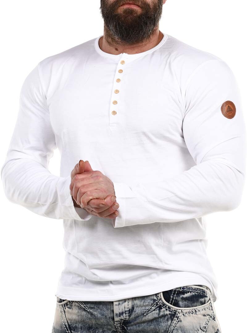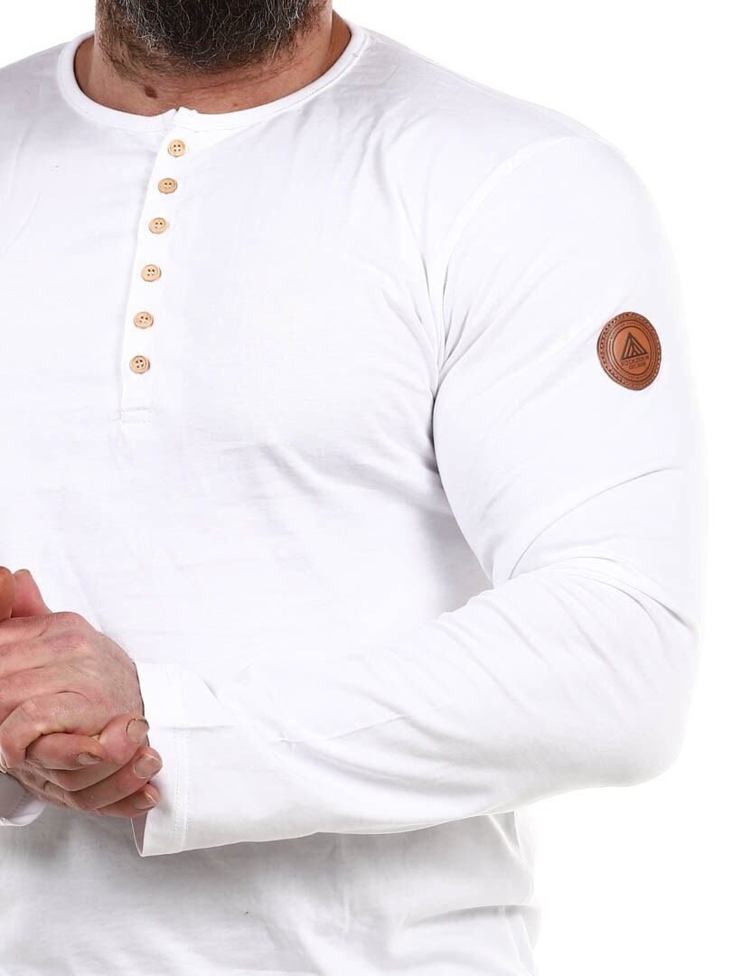 Här har vi framställt vår egna longsleeve i 100% bomull. Den har klassisk passform och är designad med knappöppning framtill. Patch i läderimitation med logotyp på vänster ärm.