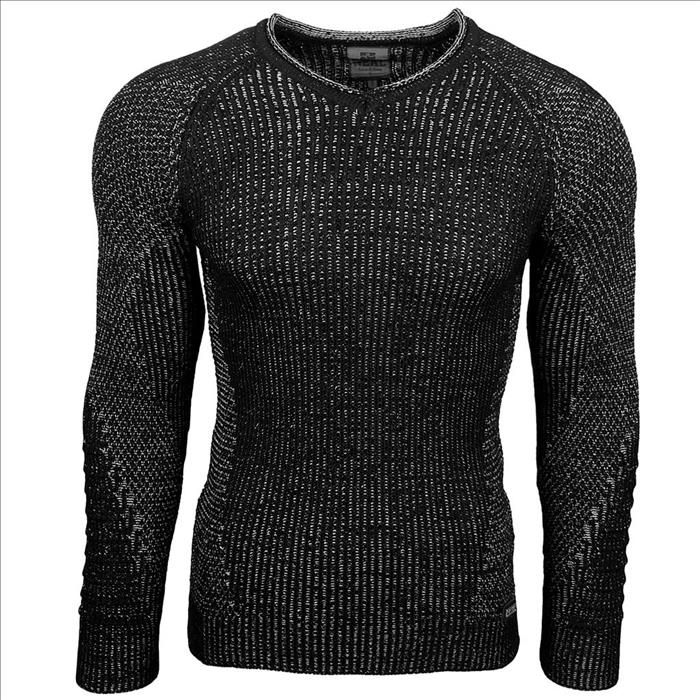 Tröja med v-ringad hals, stickad i flera olika mönsterstickningar. Stretchigt material med markerade ärmar och patch med logga i linningen nertill.