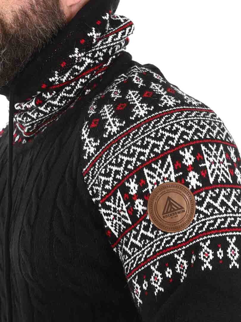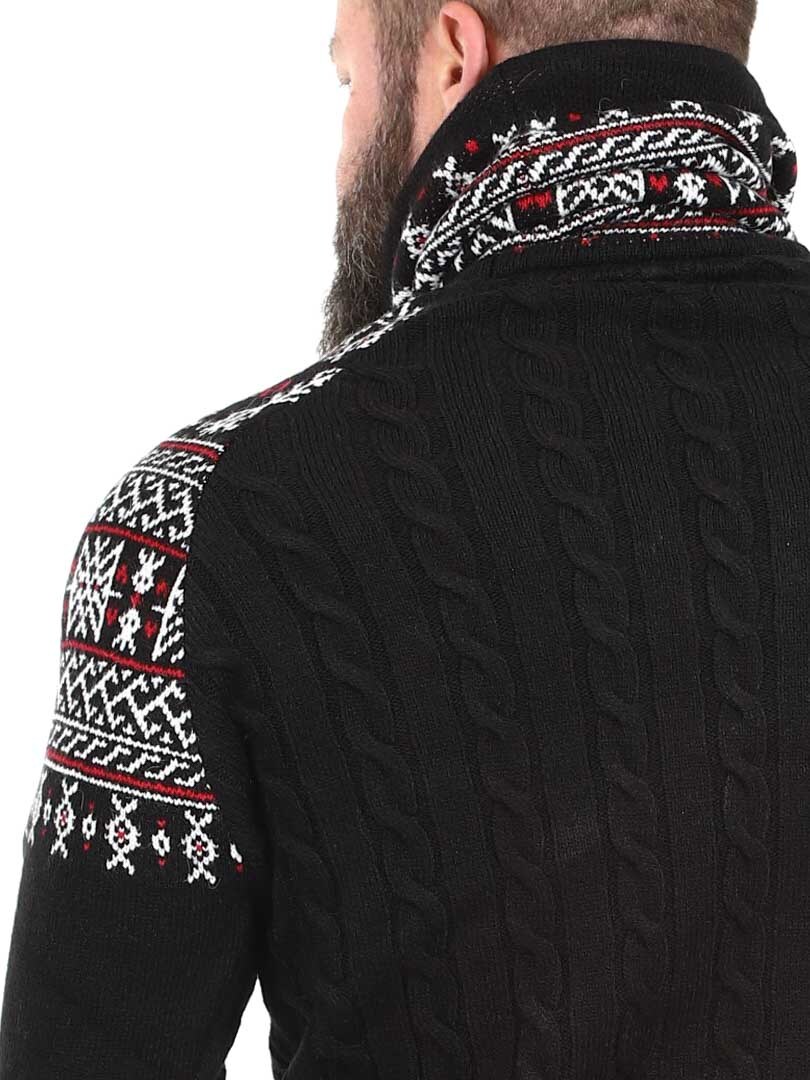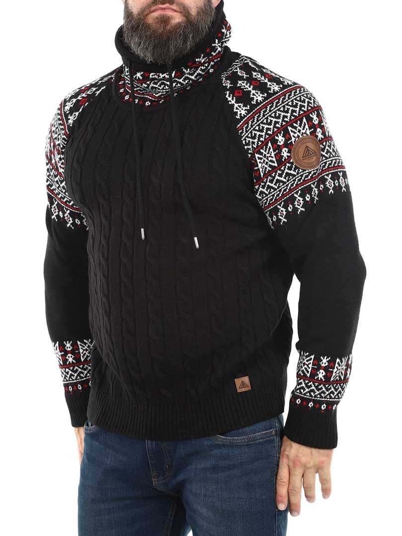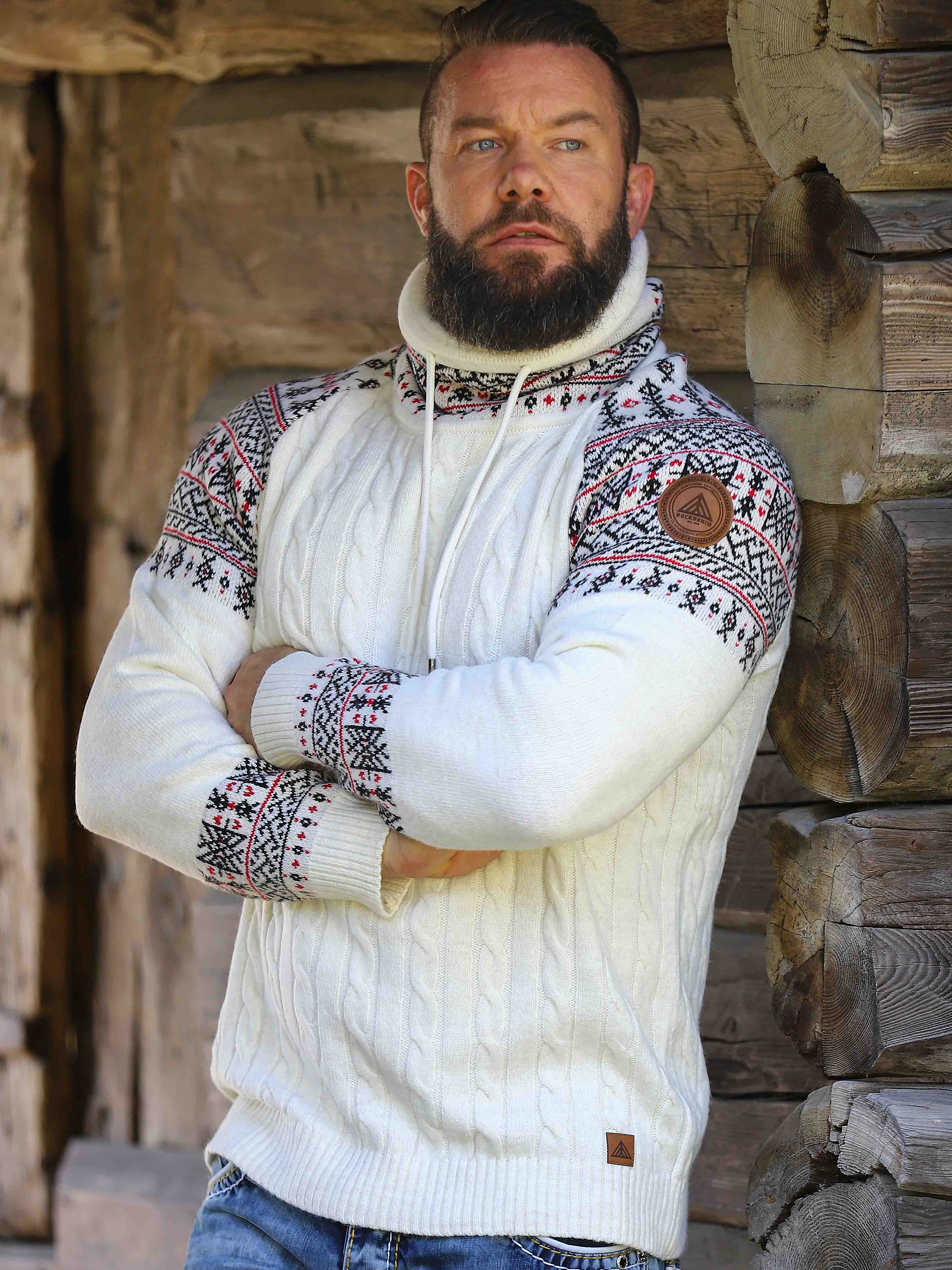 Kabelstickad tröja. Designad med hög hals som kan regleras med snören. Ärmar och hals framhävs med snyggt mönster i kontrastfärger. Denna tröja är specialtillverkad för våra kunder och finns endast hos RockDenim!