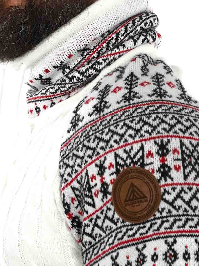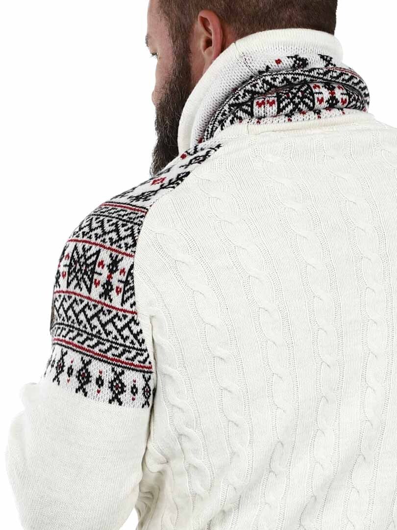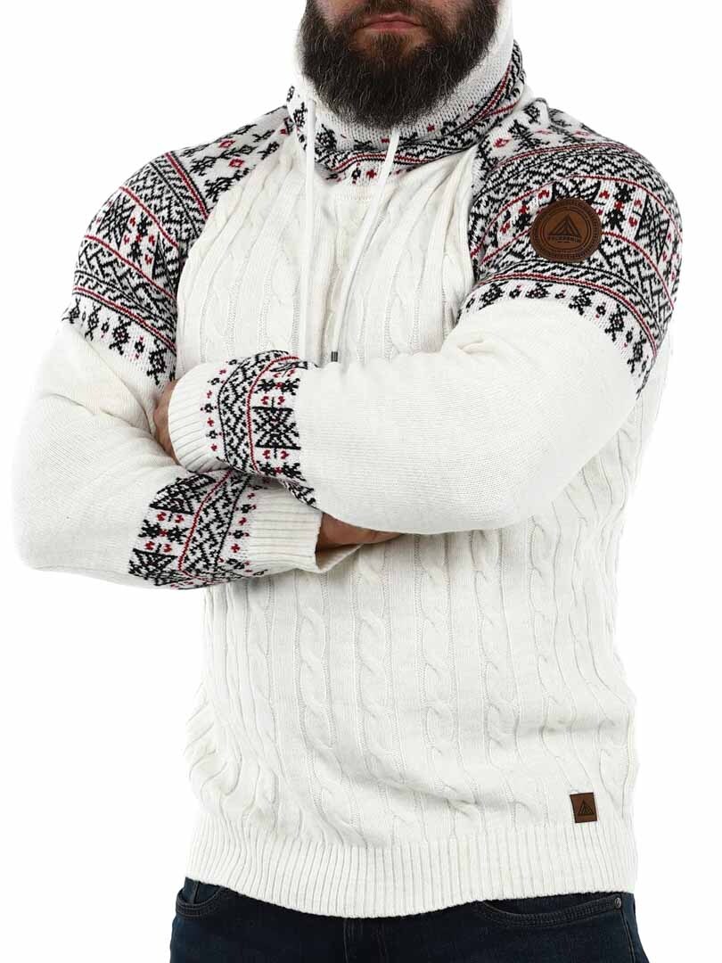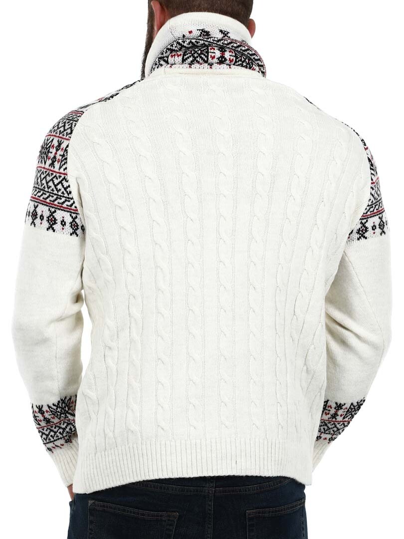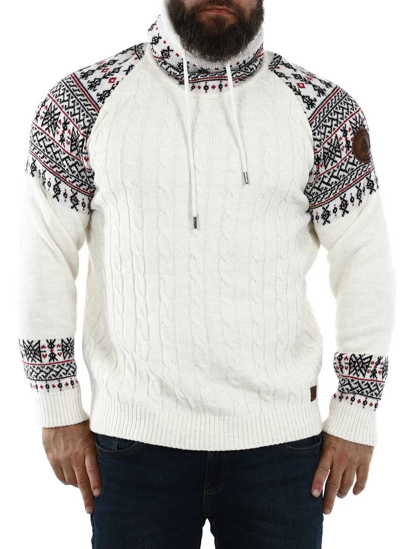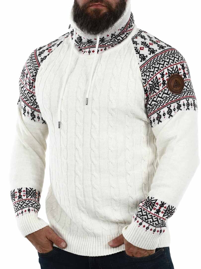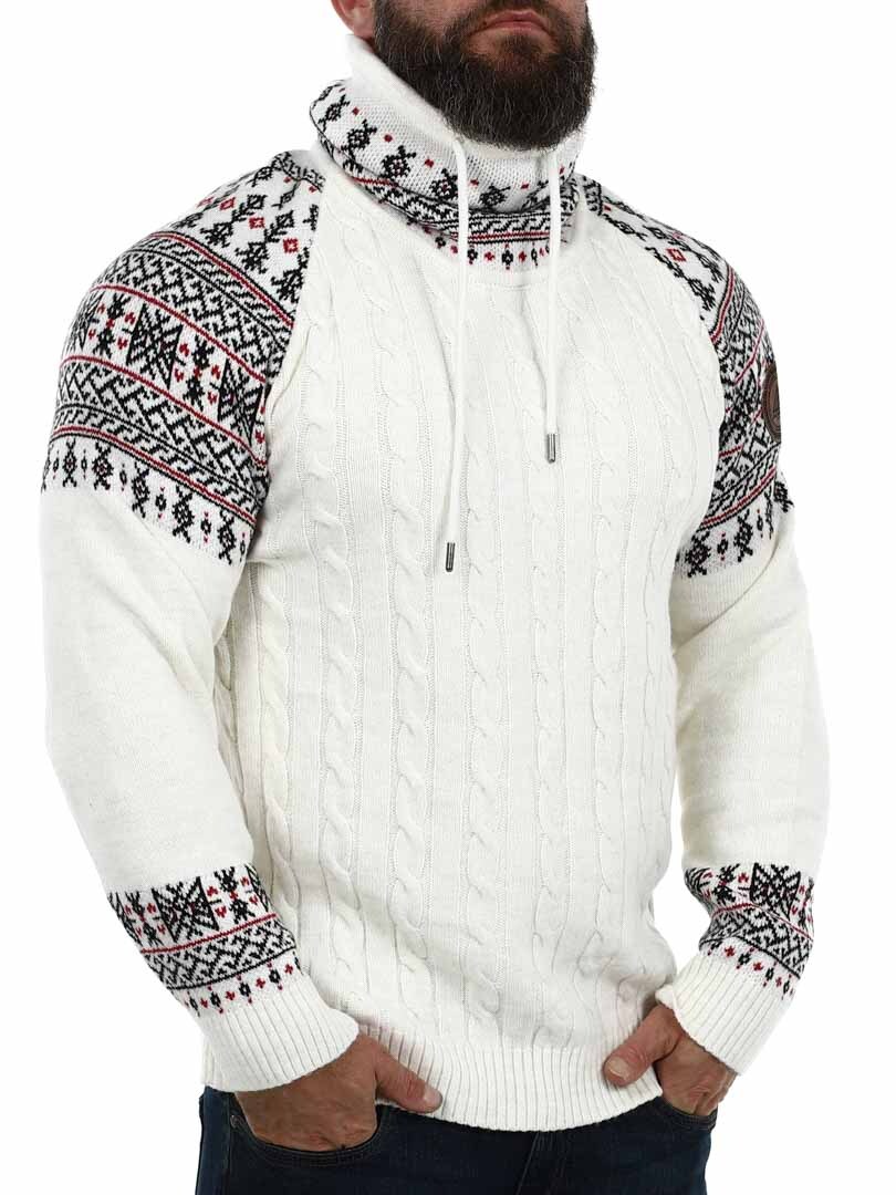 Kabelstickad tröja. Designad med hög hals som kan regleras med snören. Ärmar och hals framhävs med snyggt mönster i kontrastfärger. Denna tröja är specialtillverkad för våra kunder och finns endast hos RockDenim!