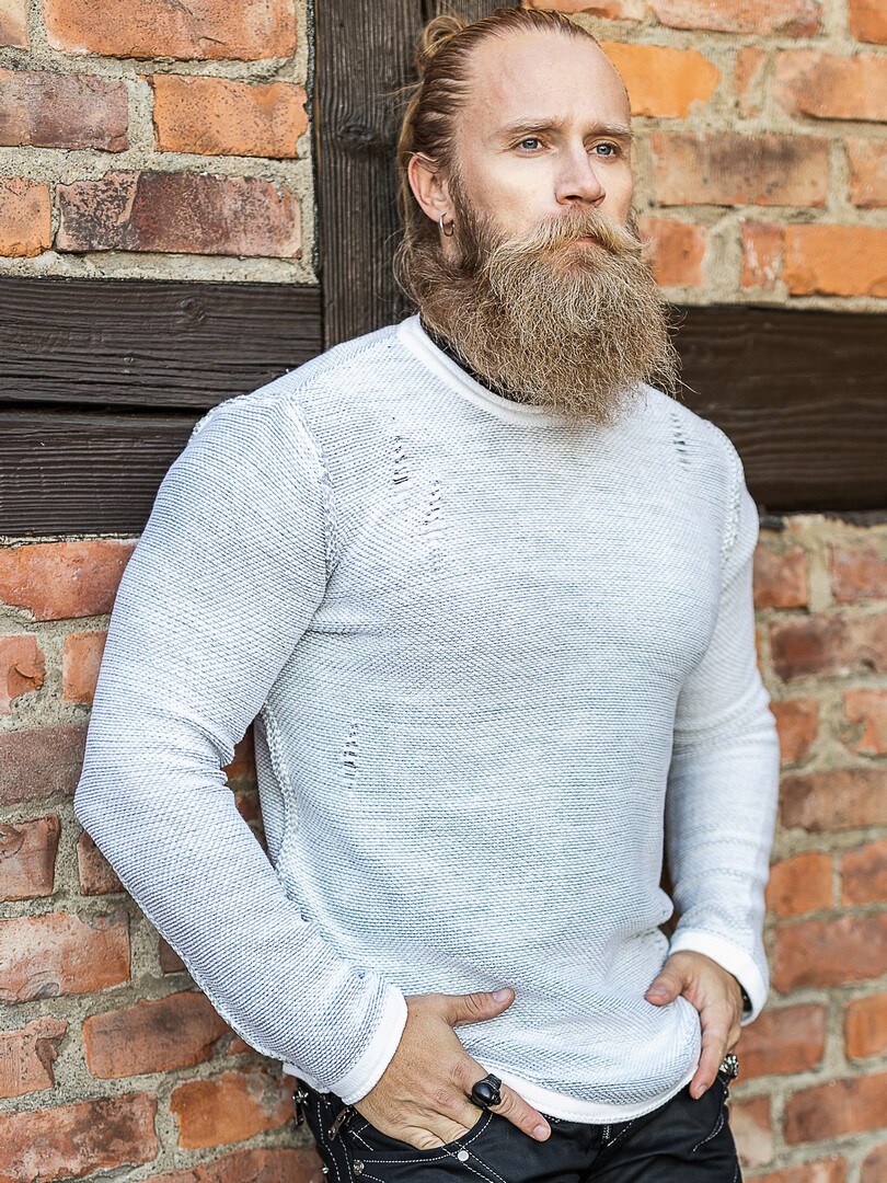 En maskulin tröja som kombinerar stilren design med rå attityd. Den stickade strukturen tillsammans med slitna detaljer vid axlar, sidor och ärmar ger plagget ett tufft och modernt uttryck. Modellen har rund halsringning och en bekväm passform som gör den lätt att bära både till jeans och mer uppklädda byxor. Perfekt för dig som vill ha en tröja med stark karaktär och detaljer som sticker ut!