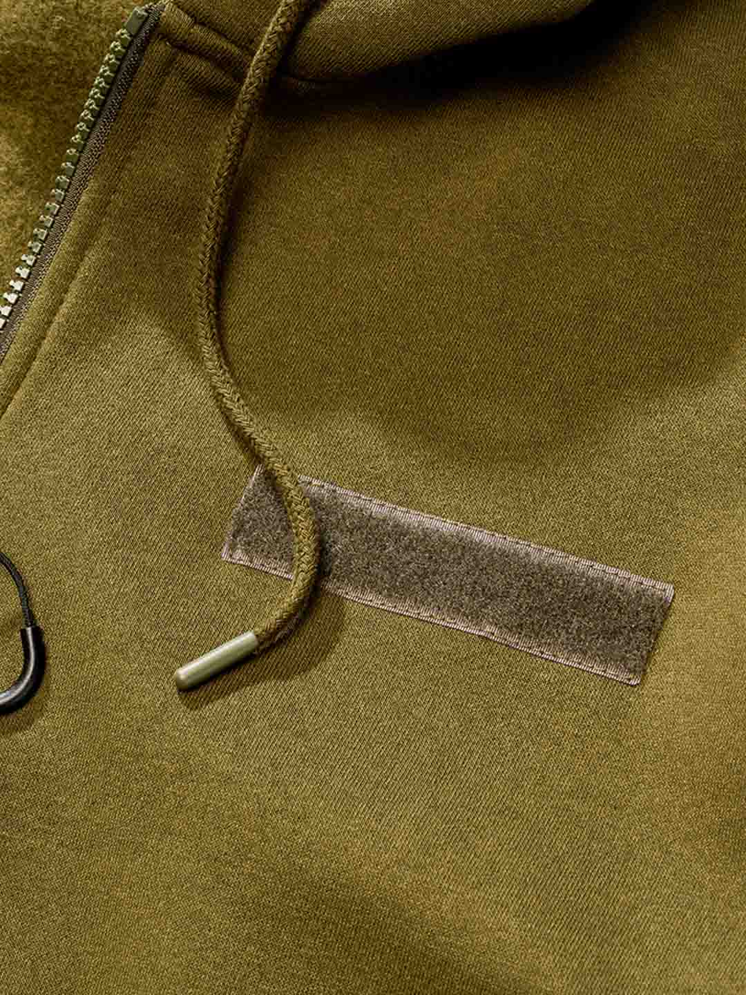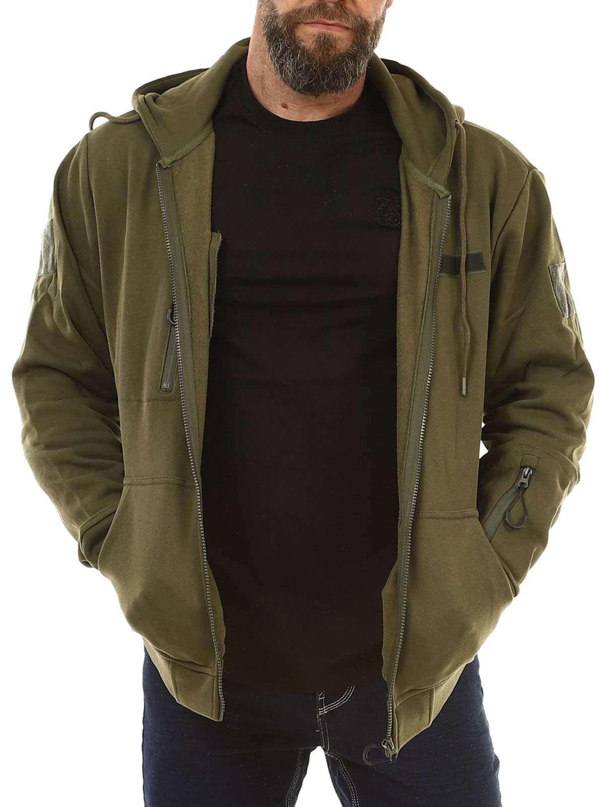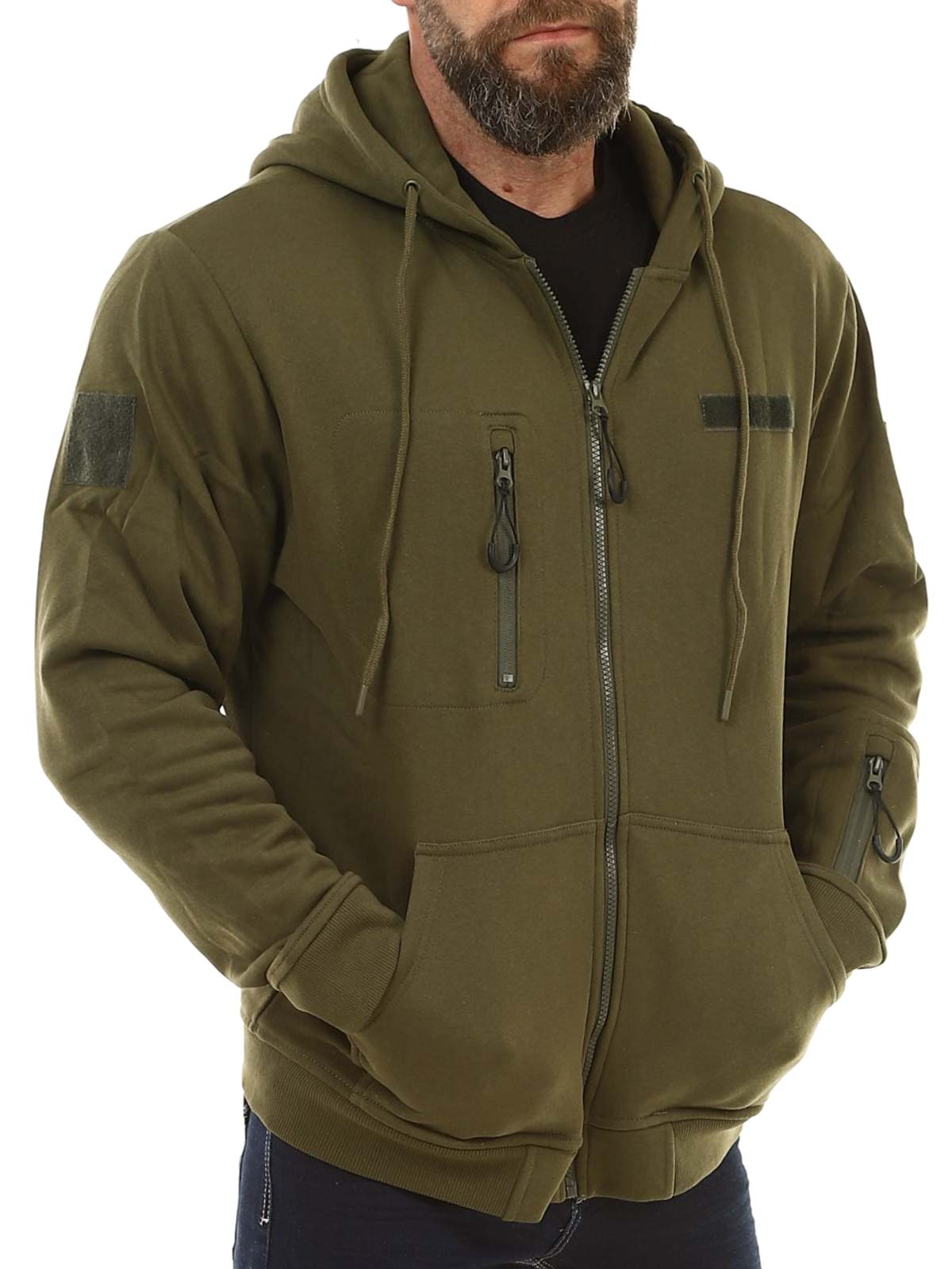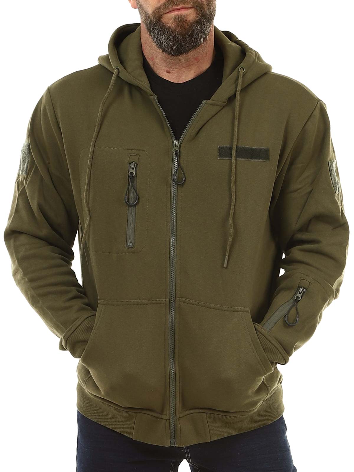 Praktisk huvtröja i en mörkare grön färg. Tröjan har en dragkedja framtill och en justerbar huva med snörning. Den är utrustad med en bröstficka, en ficka på armen samt två fickor framtill. De ribbade muddarna vid ärmsluten och nederkanten ger en bekväm passform, medan den borstade insidan gör tröjan mjuk och varm att bära.